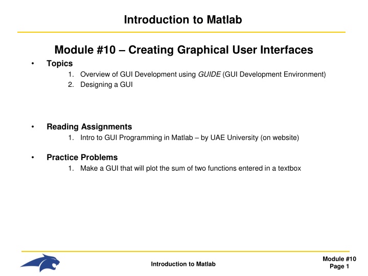 Introduction to Matlab Module #10 Creating Graphical User Interfaces Topics 1. Overview of GUI Development using GUIDE (GUI Development Environment) 2. Designing a GUI Reading Assignments 1. Intro to GUI Programming in Matlab by UAE University (on website) Practice Problems 1. Make a GUI that will plot the sum of two functions entered in a textbox Module #10 Page 1 Introduction to Matlab