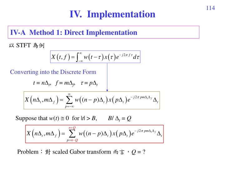 114 IV. Implementation IV-A Method 1: Direct Implementation STFT ( ) ( ) ( ) x = 2 j f , X t f w t e d Converting into the Discrete Form t = n t, f = m f, = p t ( ) ( ) ( x p ) 2 j pm = , ( ) X n m w n p e t f t f t t t = p Suppose that w(t) 0 for |t| > B, B/ t= Q ( , n p = n Q + ) ( ) ( x p ) 2 j pm = ( ) X n m w n p e t f t f t t t Q Problem scaled Gabor transform Q = ?