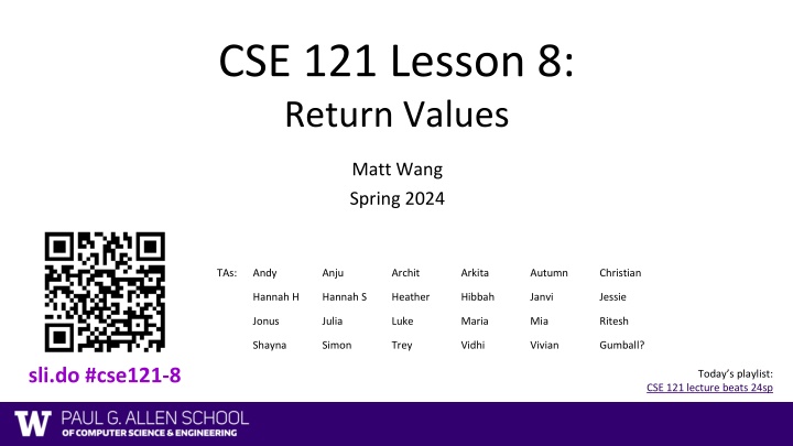 CSE 121 Lesson 8: Return Values Matt Wang Spring 2024 Andy Anju Archit Arkita Autumn Christian TAs: Hannah H Hannah S Heather Hibbah Janvi Jessie Jonus Julia Luke Maria Mia Ritesh Shayna Simon Trey Vidhi Vivian Gumball? sli.do #cse121-8 Today s playlist: CSE 121 lecture beats 24sp