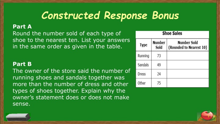Constructed Response Bonus Part A Round the number sold of each type of shoe to the nearest ten. List your answers in the same order as given in the table. Part B The owner of the store said the number of running shoes and sandals together was more than the number of dress and other types of shoes together. Explain why the owner s statement does or does not make sense. 1