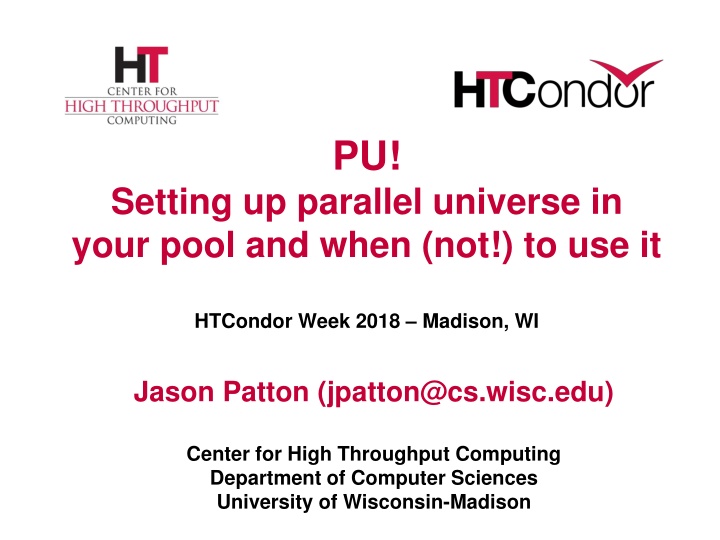 PU! Setting up parallel universe in your pool and when (not!) to use it HTCondor Week 2018 Madison, WI Jason Patton (jpatton@cs.wisc.edu) Center for High Throughput Computing Department of Computer Sciences University of Wisconsin-Madison