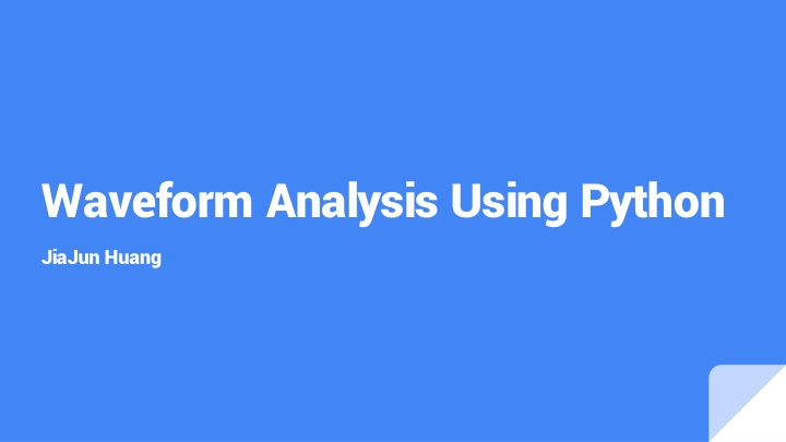 Explore waveform analysis techniques in Python with JiaJun Huang. Learn about setting up a step motor system, UV light, scintillator tile, SiPM, and RCDAQ for data analysis. Discover methods for analyzing single pulse waveforms, performing Chi Square analysis, and visualizing data using Gaussian plots and heatmaps.