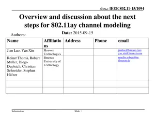 This presentation discusses the extension of the legacy IEEE 802.11ad channel model to support SU-MIMO and channel bonding PHY features proposed in 11ay. It includes details on channel model requirements, scenarios, beamforming algorithms, and practical steps for updating the model to accommodate ne
