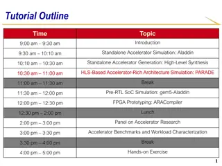 Explore a comprehensive agenda covering various aspects of accelerator-rich architecture, from standalone simulation to FPGA prototyping. Key topics include Aladdin simulation, High-Level Synthesis (HLS) generation, PARADE architecture simulation, gem5-Aladdin SoC simulation, and more. Join the disc