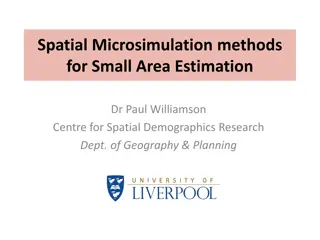 Explore spatial microsimulation methods for small area estimation in geographical research, focusing on direct survey estimation, conventional SAE approaches, and unconventional SAE approaches like spatial microsimulation. Learn about techniques, challenges, and potential solutions in small area est