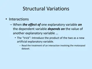 In the context of the Motorpool dataset, structural variations and interactions are explored, focusing on how the effect of one explanatory variable on the dependent variable can change based on another variable. The technique involves introducing the product of the two variables as a new artificial
