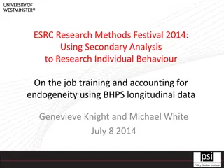 This presentation at the ESRC Research Methods Festival 2014 discusses the utilization of secondary analysis, focusing on exploring individual behavior in the context of on-the-job training. It delves into accounting for endogeneity using BHPS longitudinal data, presented by Genevieve Knight and Mic
