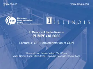 This text discusses the GPU implementation of Convolutional Neural Networks (CNN), focusing on LeNet-5 architecture for Hand-Written Digit Recognition. It covers topics such as the structure of CNN, the use of convolutional layers, and the forward path of a convolutional layer output. Additionally,