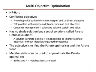 Discover the world of multi-objective optimization with NP-hard conflicting objectives, Pareto optimal solutions, and metaheuristics. Learn about fitness assignment, diversity preservation, and dominance-based strategies for finding Pareto optimal sets. Explore hybrid metaheuristics combining variou