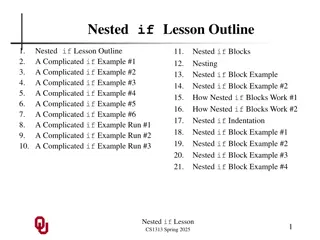 Explore the concept of nested if blocks in programming through a detailed lesson outline and complicated if examples. Learn how nested if blocks work, the indentation rules, and how to implement them effectively. Gain insights into handling complex conditional scenarios and optimizing code flow.
