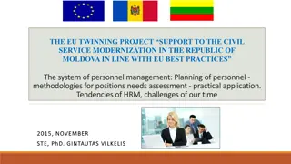 Explore the EU Twinning Project supporting civil service modernization in Moldova, focusing on HR management methodologies, personnel planning, and challenges in HRM. Learn about the role of HR units, needs assessment, and application of methodologies in personnel management. Discover methods like c