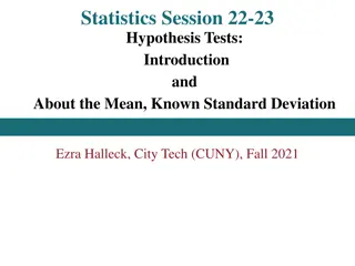 Learn about hypothesis testing procedures, cases, and calculations when the population standard deviation is known. Explore the p-value and critical-value approaches, different cases based on sample size and distribution, and how to calculate the z value for x bar. Master the concepts through clear