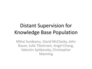 Distant supervision is utilized for knowledge base population, with a focus on slot filling tasks and generating training data automatically from Wikipedia infoboxes. The approach involves mapping infobox fields to slots, finding relevant sentences using information retrieval, and training multiclas