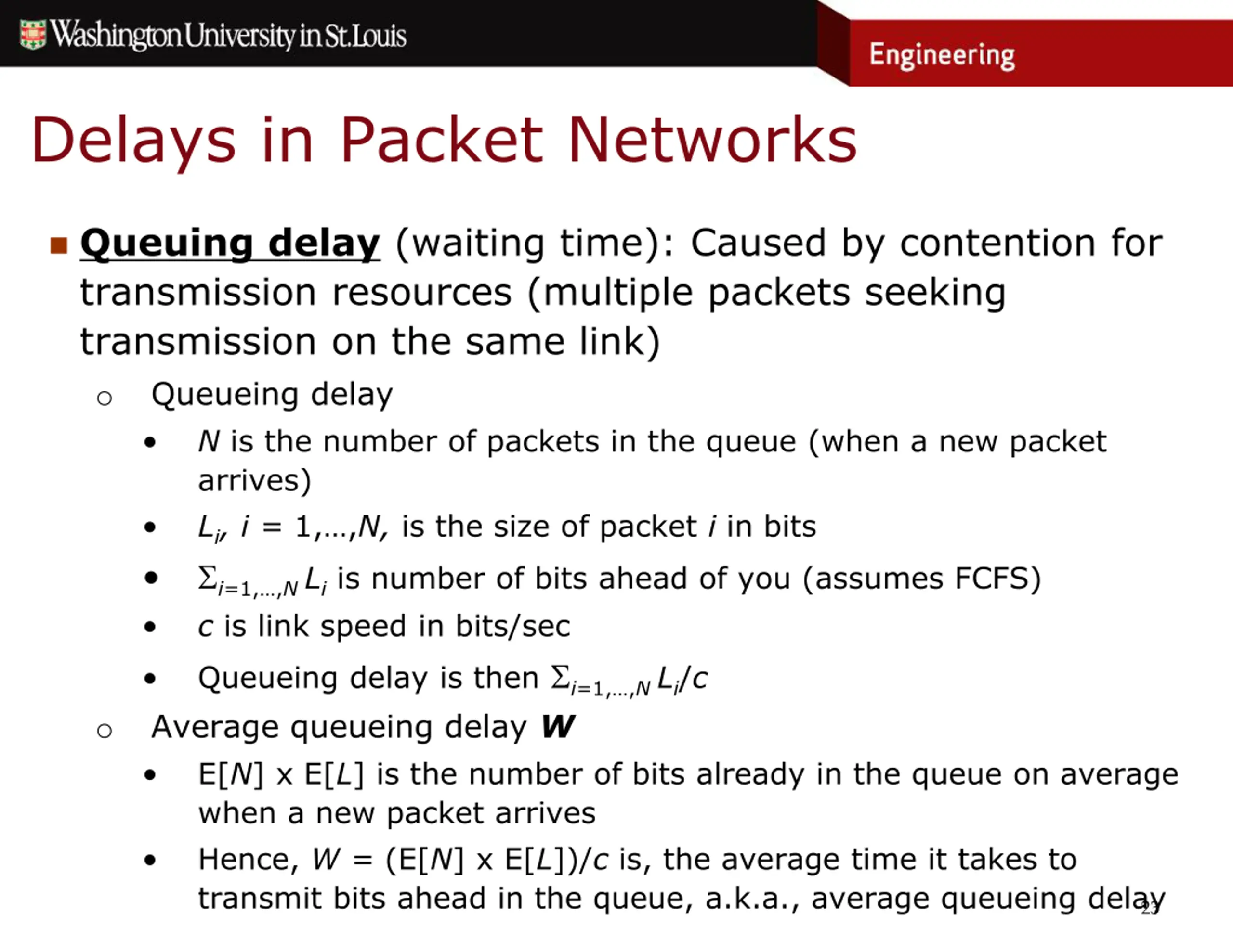 Delays in Packet Networks Queuing delay (waiting time): Caused by contention for transmission resources (multiple packets seeking transmission on the same link) Queueing delay N is the number of packets in the queue (when a new packet arrives) Li, i =1, ,N, is the size of packet i in bits i=1, ,N Li is number of bits ahead of you (assumes FCFS) c is link speed in bits/sec Queueing delay is then i=1, ,N Li/c o Average queueing delayW E[N] x E[L] is the number of bits already in the queue on average when a new packet arrives Hence, W = (E[N] x E[L])/c is, the average time it takes to transmit bits ahead in the queue, a.k.a., average queueing delay o 23