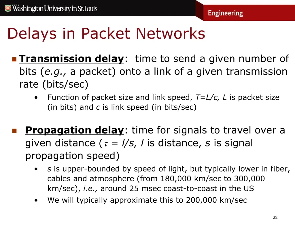 Delays in Packet Networks Transmission delay: time to send a given number of bits (e.g., a packet) onto a link of a given transmission rate (bits/sec) Function of packet size and link speed, T=L/c,L is packet size (in bits) and c is link speed (in bits/sec) Propagation delay: time for signals to travel over a given distance ( = l/s, l is distance, s is signal propagation speed) s is upper-bounded by speed of light, but typically lower in fiber, cables and atmosphere (from 180,000 km/sec to 300,000 km/sec), i.e., around 25 msec coast-to-coast in the US We will typically approximate this to 200,000 km/sec 22
