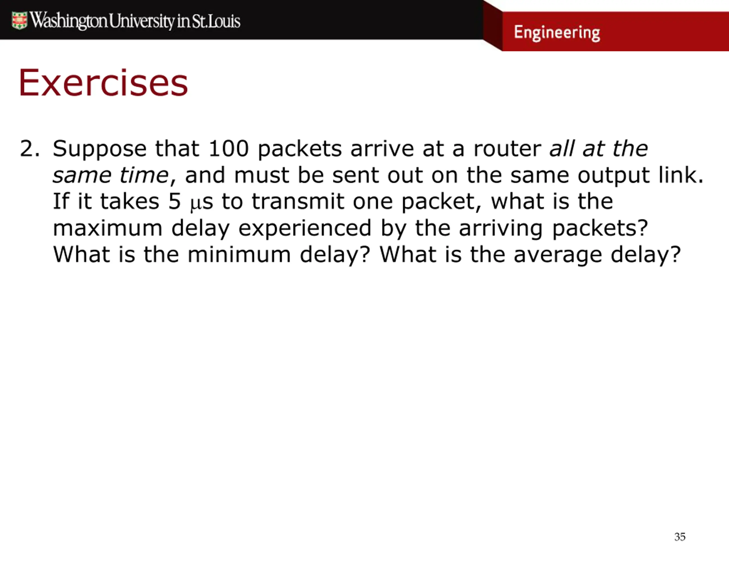 Exercises 2. Suppose that 100 packets arrive at a router all at the same time, and must be sent out on the same output link. If it takes 5 s to transmit one packet, what is the maximum delay experienced by the arriving packets? What is the minimum delay? What is the average delay? 35