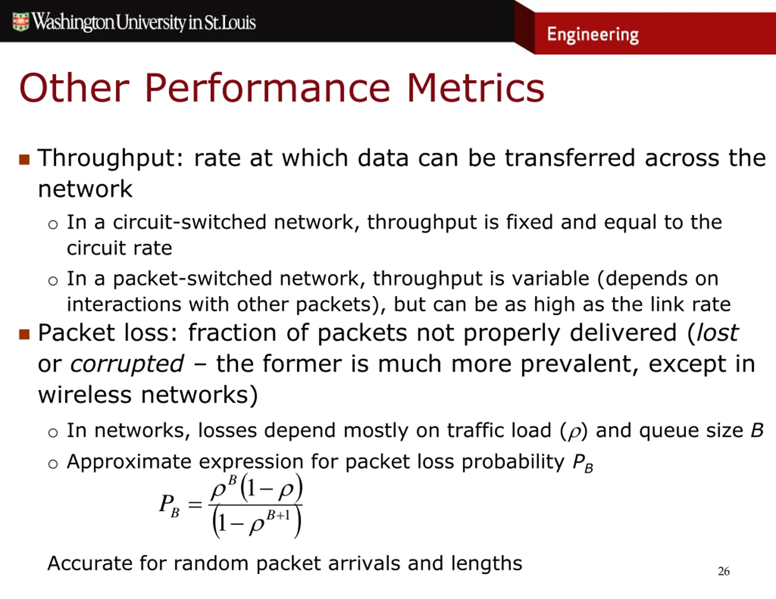 Other Performance Metrics Throughput: rate at which data can be transferred across the network o In a circuit-switched network, throughput is fixed and equal to the circuit rate o In a packet-switched network, throughput is variable (depends on interactions with other packets), but can be as high as the link rate Packet loss: fraction of packets not properly delivered (lost or corrupted the former is much more prevalent, except in wireless networks) o In networks, losses depend mostly on traffic load ( ) and queue size B o Approximate expression for packet loss probability PB ( ) ( 1 B B 1 = B P ) + 1 Accurate for random packet arrivals and lengths 26