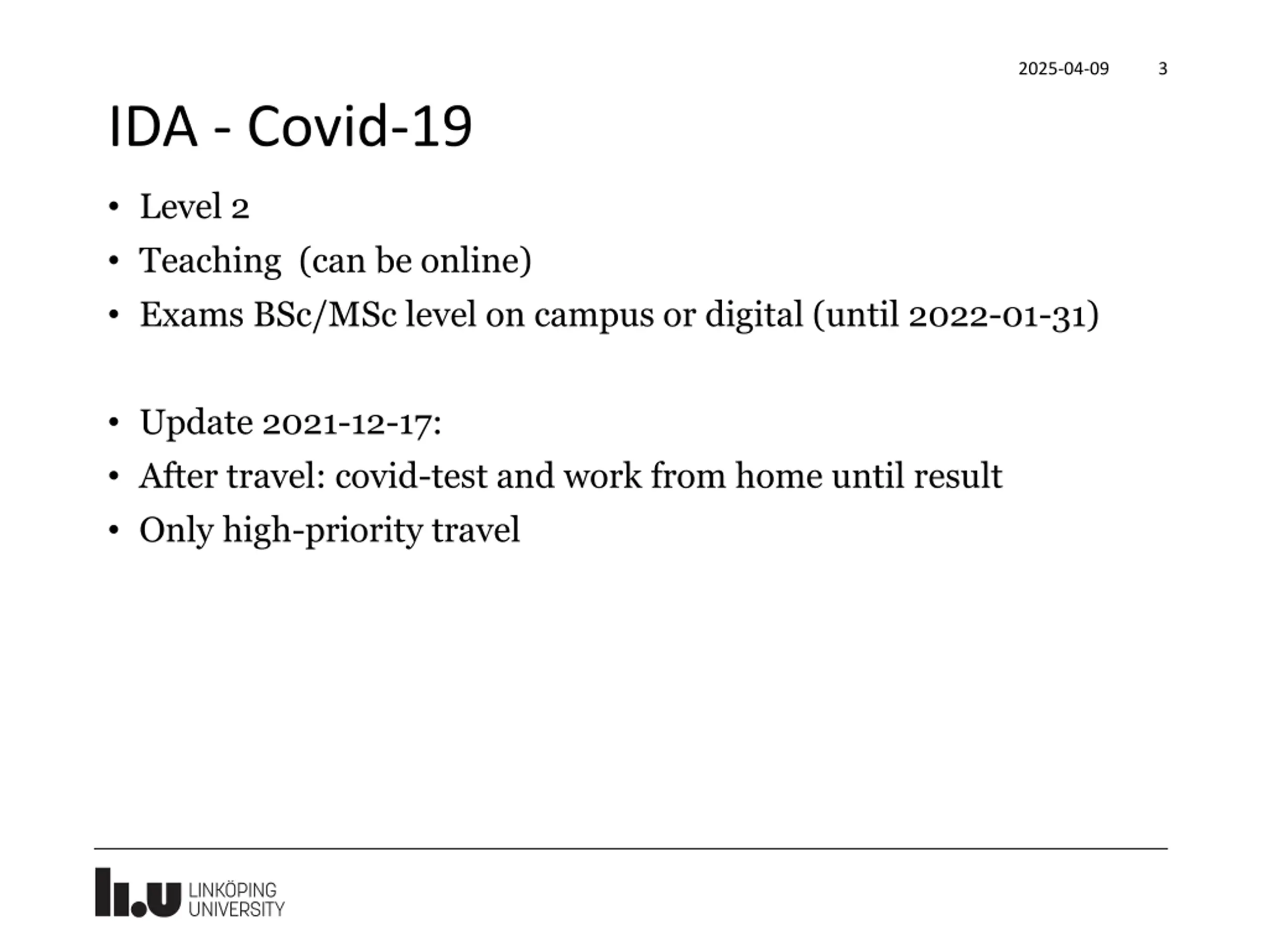 2025-04-09 3 IDA - Covid-19 Level 2 Teaching (can be online) Exams BSc/MSc level on campus or digital (until 2022-01-31) Update 2021-12-17: After travel: covid-test and work from home until result Only high-priority travel