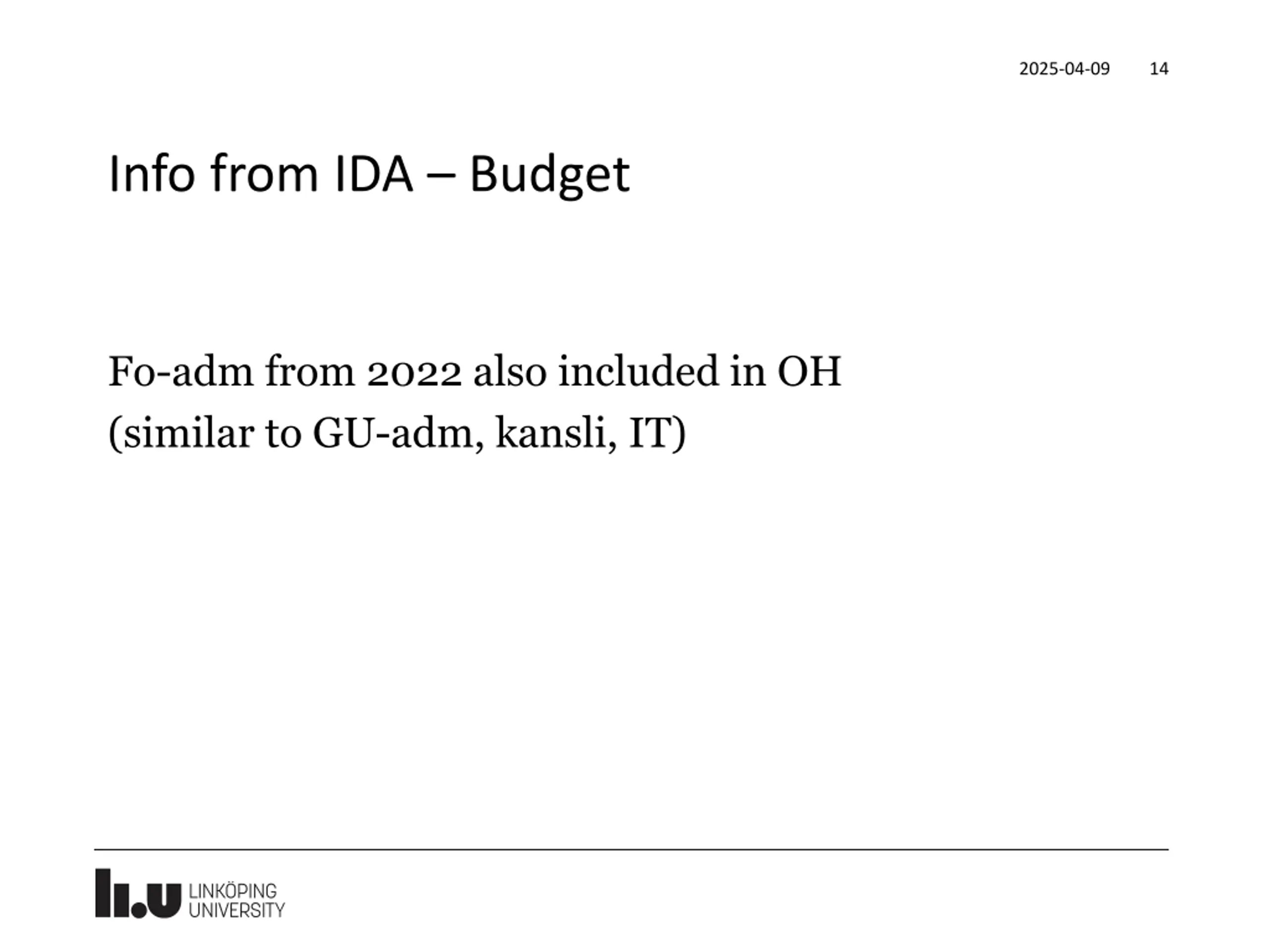 2025-04-09 14 Info from IDA Budget Fo-adm from 2022 also included in OH (similar to GU-adm, kansli, IT)