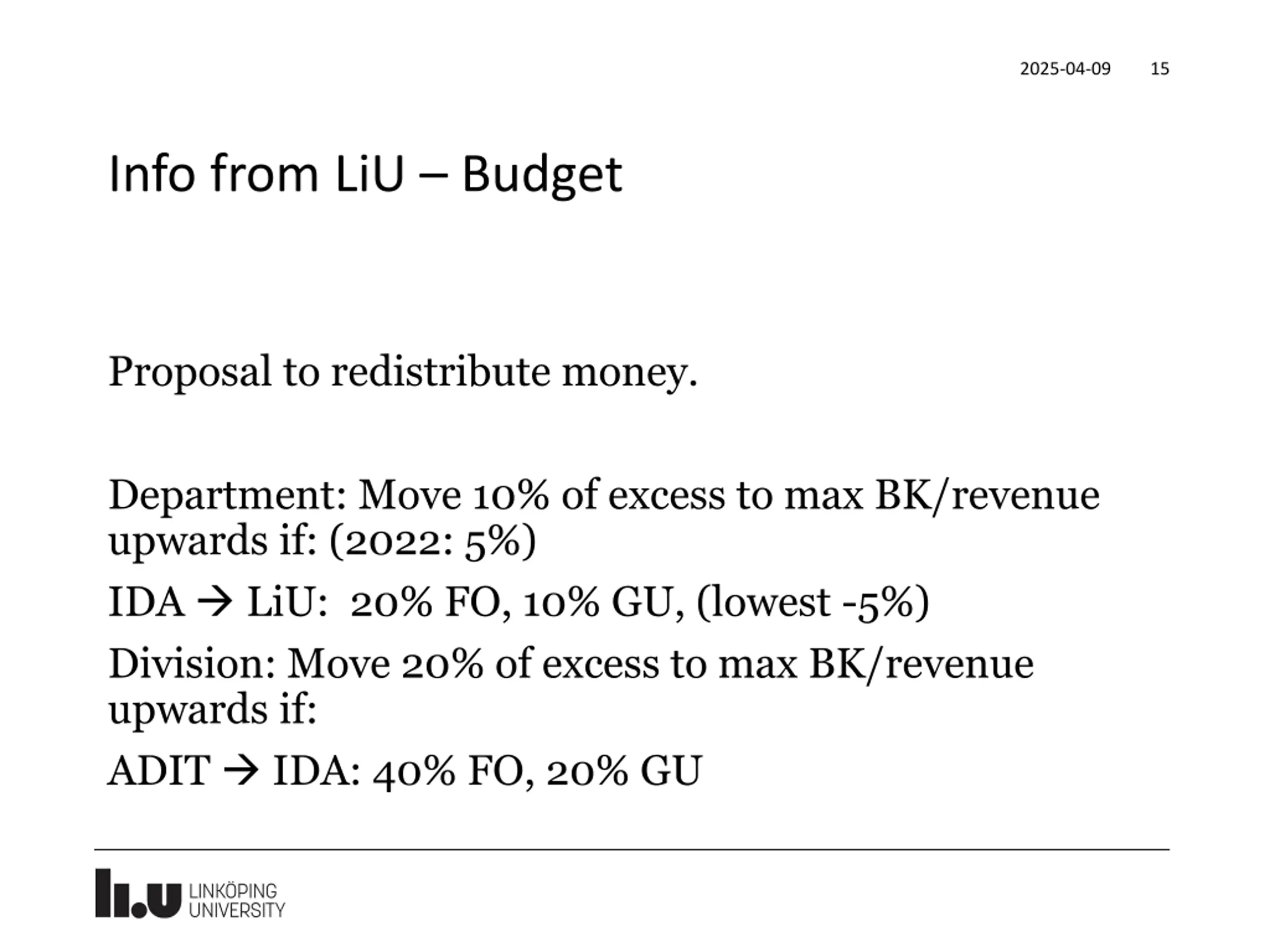 2025-04-09 15 Info from LiU Budget Proposal to redistribute money. Department: Move 10% of excess to max BK/revenue upwards if: (2022: 5%) IDA LiU: 20% FO, 10% GU, (lowest -5%) Division: Move 20% of excess to max BK/revenue upwards if: ADIT IDA: 40% FO, 20% GU