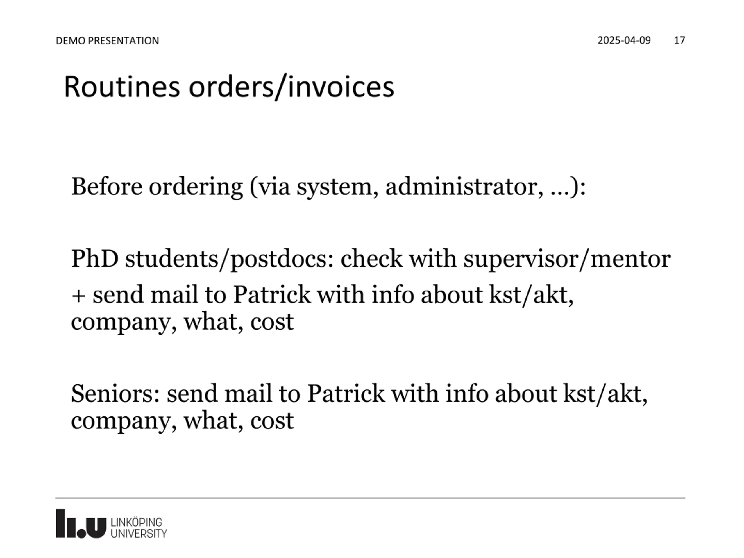 2025-04-09 17 DEMO PRESENTATION Routines orders/invoices Before ordering (via system, administrator, ): PhD students/postdocs: check with supervisor/mentor + send mail to Patrick with info about kst/akt, company, what, cost Seniors: send mail to Patrick with info about kst/akt, company, what, cost