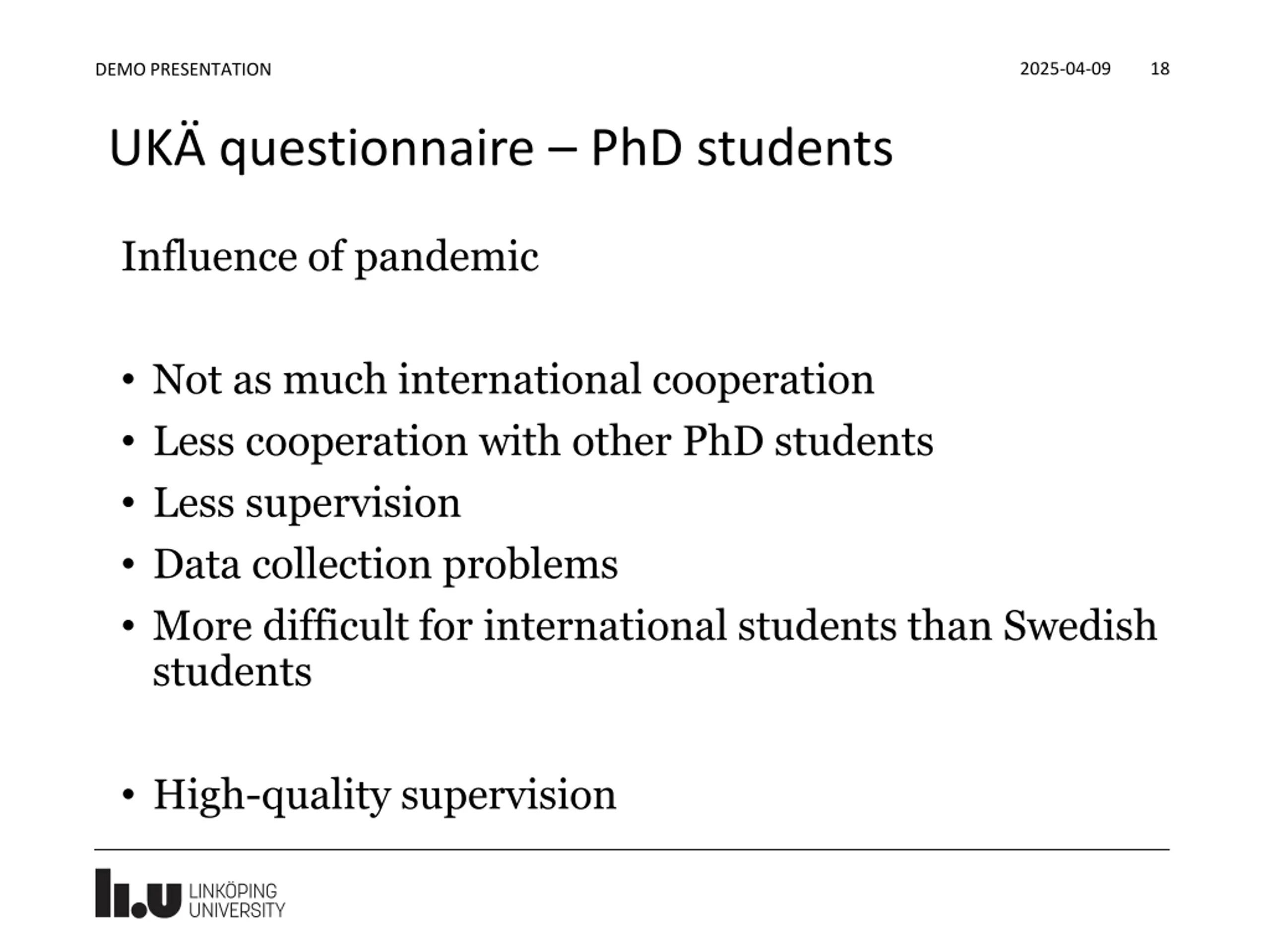 2025-04-09 18 DEMO PRESENTATION UK questionnaire PhD students Influence of pandemic Not as much international cooperation Less cooperation with other PhD students Less supervision Data collection problems More difficult for international students than Swedish students High-quality supervision
