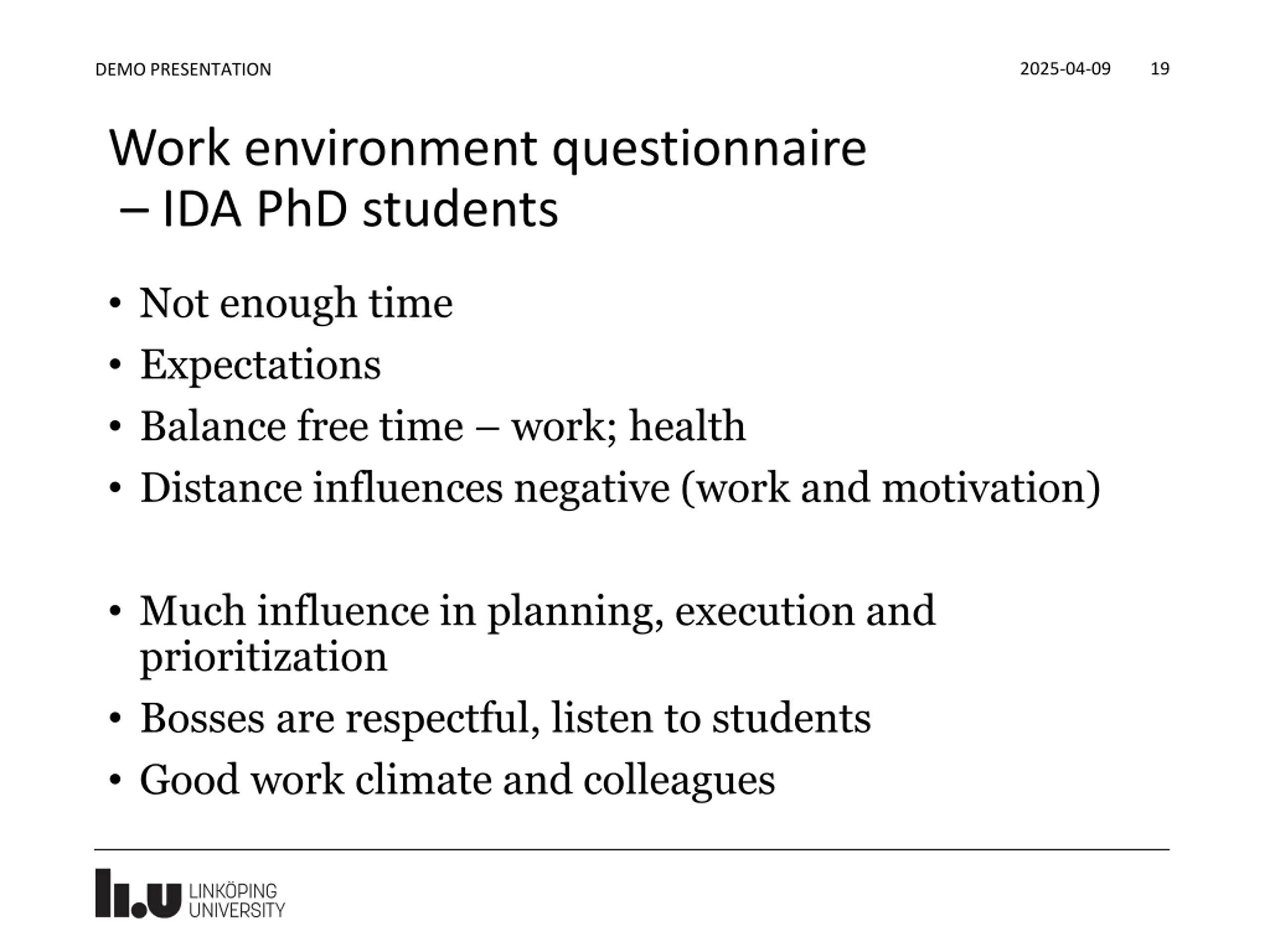 2025-04-09 19 DEMO PRESENTATION Work environment questionnaire IDA PhD students Not enough time Expectations Balance free time work; health Distance influences negative (work and motivation) Much influence in planning, execution and prioritization Bosses are respectful, listen to students Good work climate and colleagues