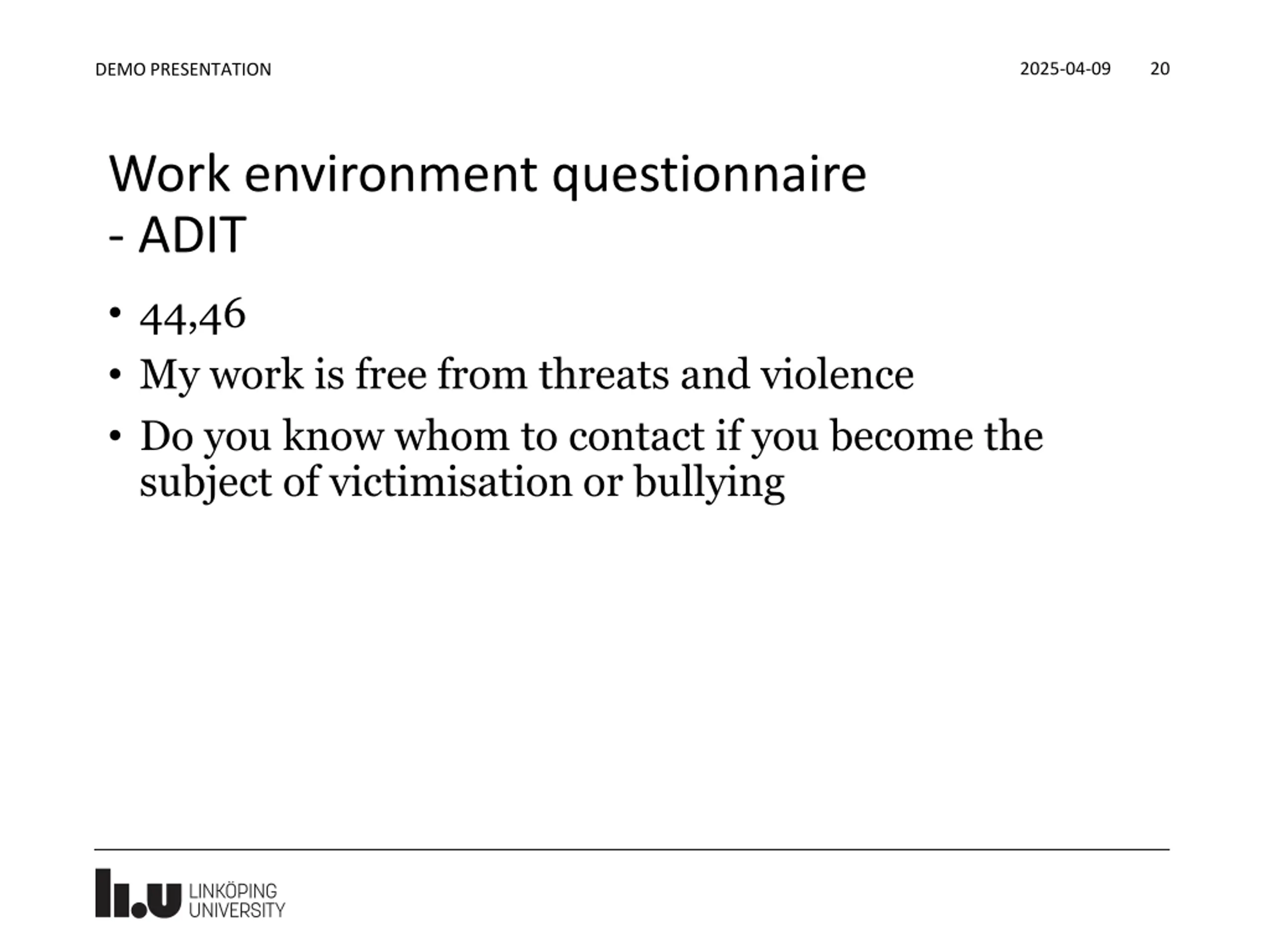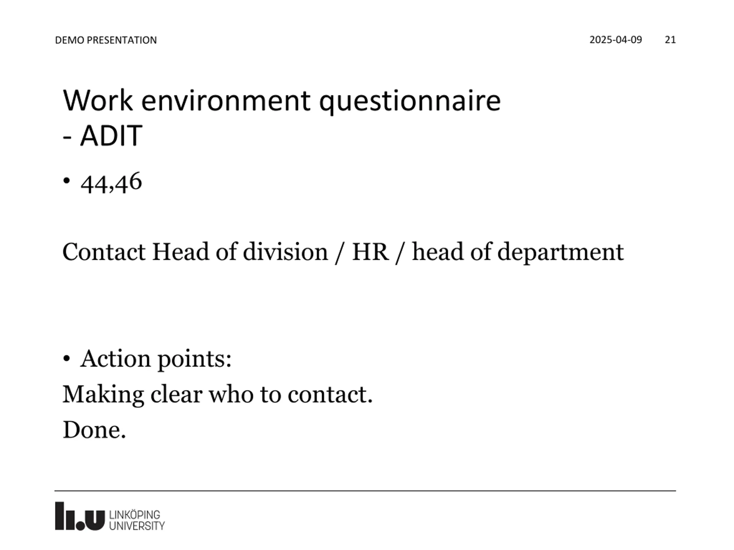 2025-04-09 21 DEMO PRESENTATION Work environment questionnaire - ADIT 44,46 Contact Head of division / HR / head of department Action points: Making clear who to contact. Done.