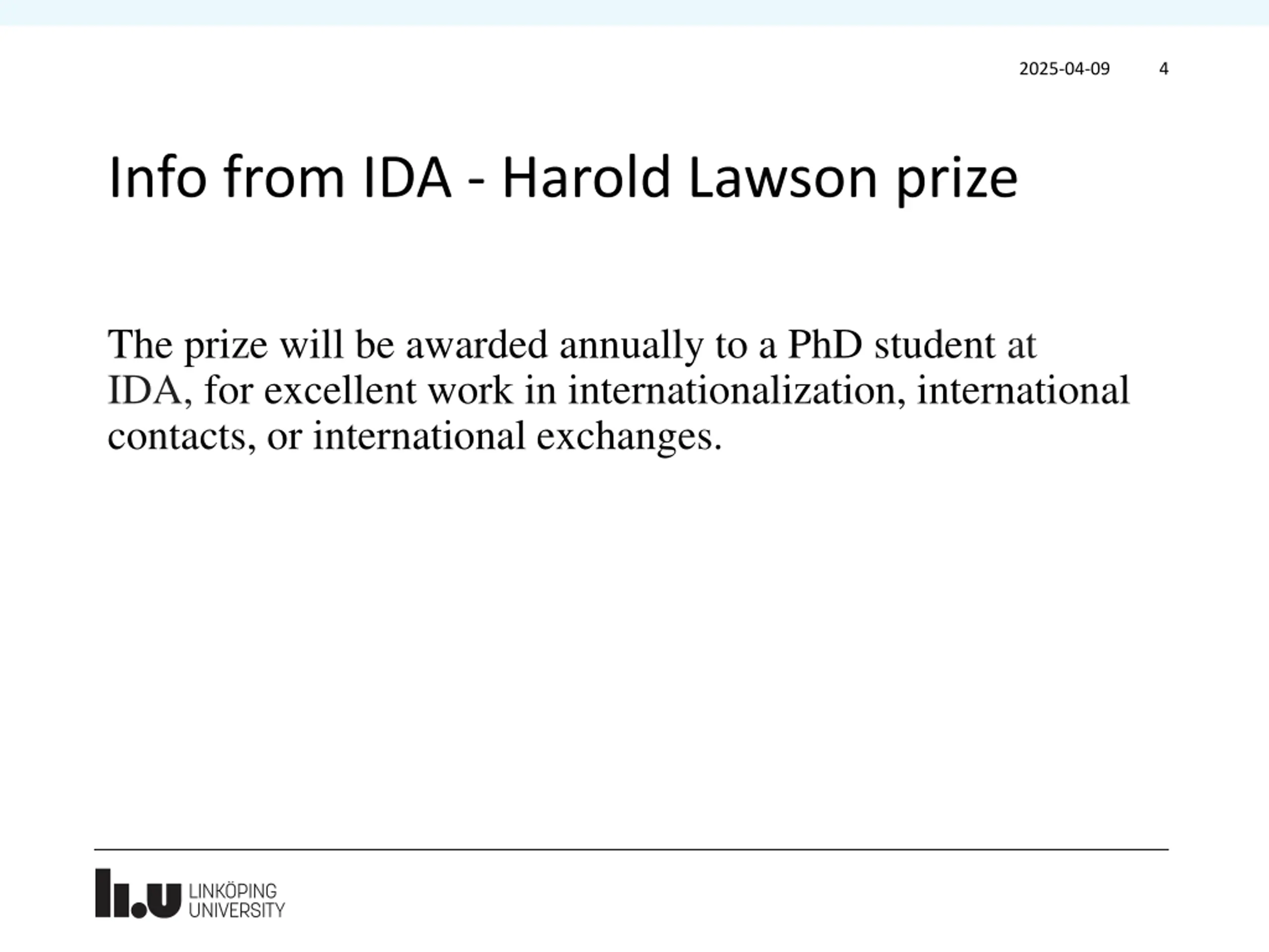 2025-04-09 4 Info from IDA - Harold Lawson prize The prize will be awarded annually to a PhD student at IDA, for excellent work in internationalization, international contacts, or international exchanges.