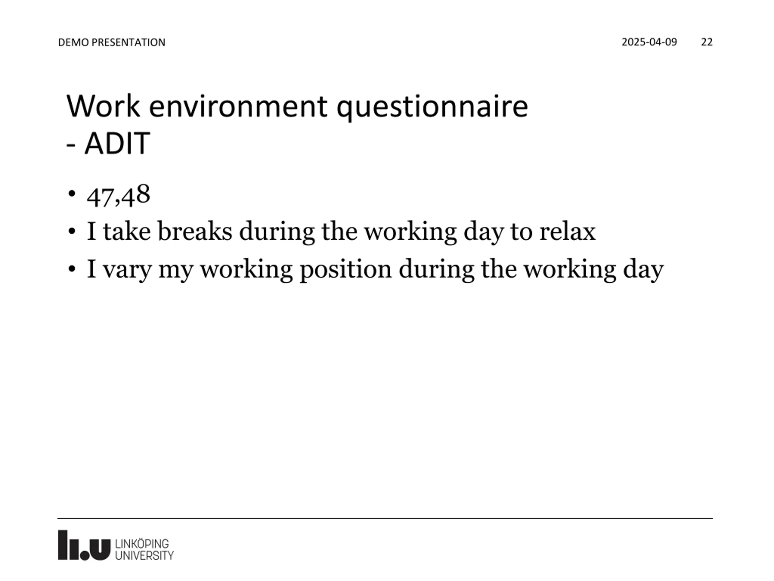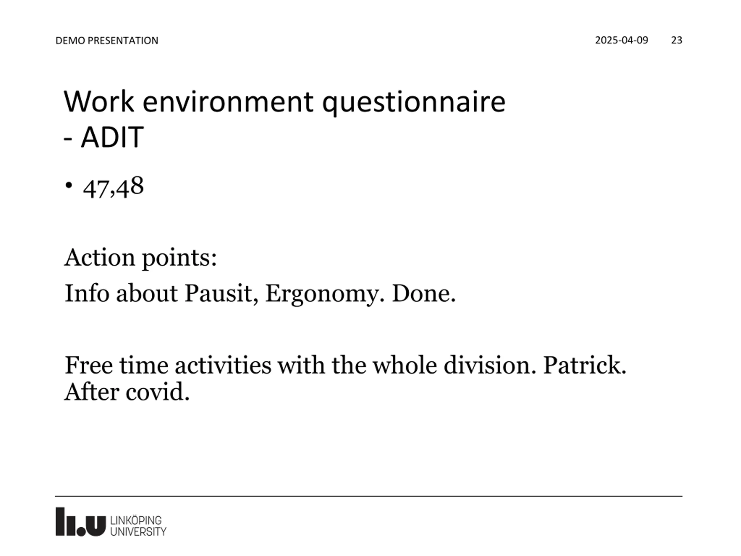 2025-04-09 23 DEMO PRESENTATION Work environment questionnaire - ADIT 47,48 Action points: Info about Pausit, Ergonomy. Done. Free time activities with the whole division. Patrick. After covid.