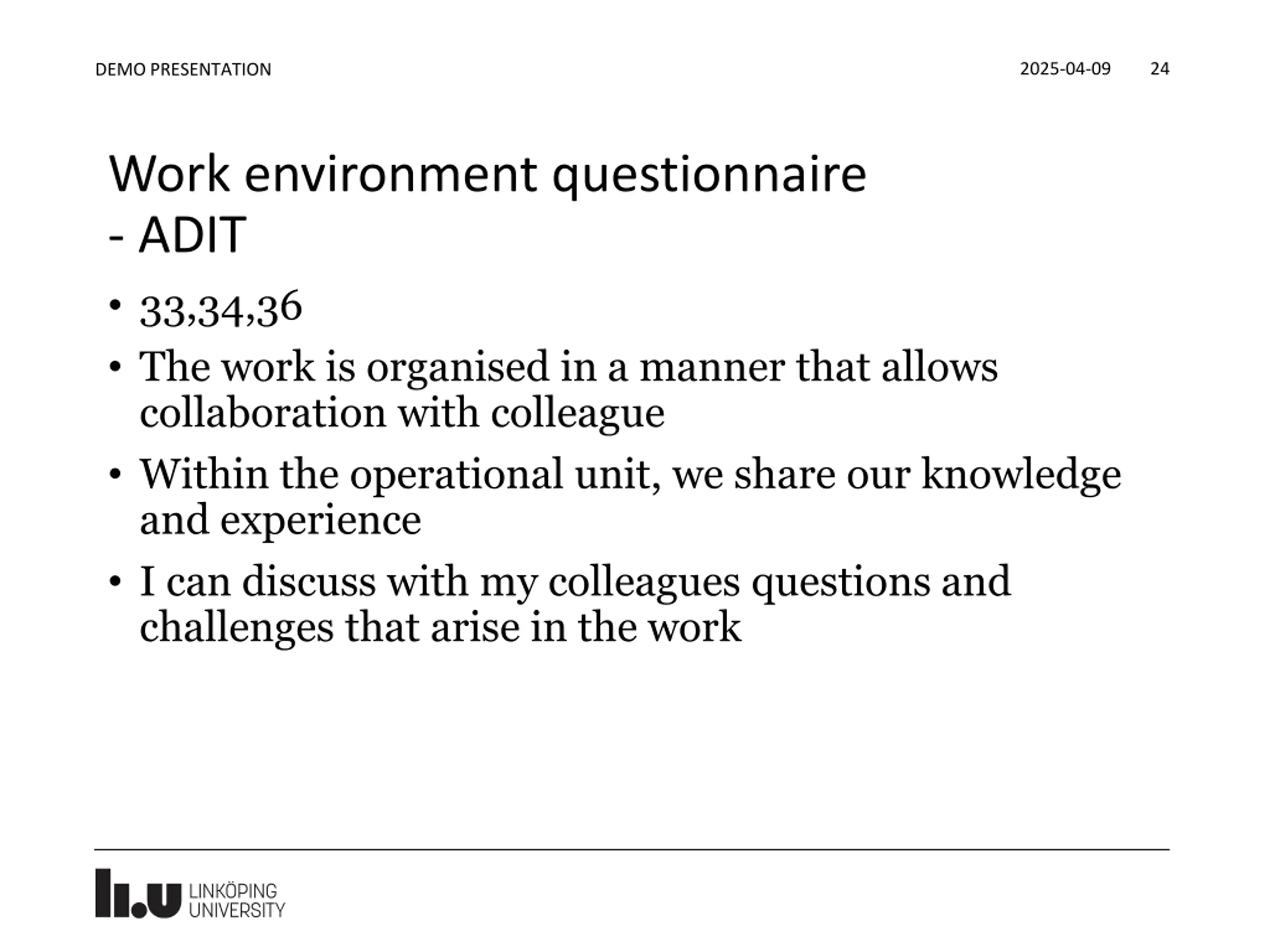 2025-04-09 24 DEMO PRESENTATION Work environment questionnaire - ADIT 33,34,36 The work is organised in a manner that allows collaboration with colleague Within the operational unit, we share our knowledge and experience I can discuss with my colleagues questions and challenges that arise in the work