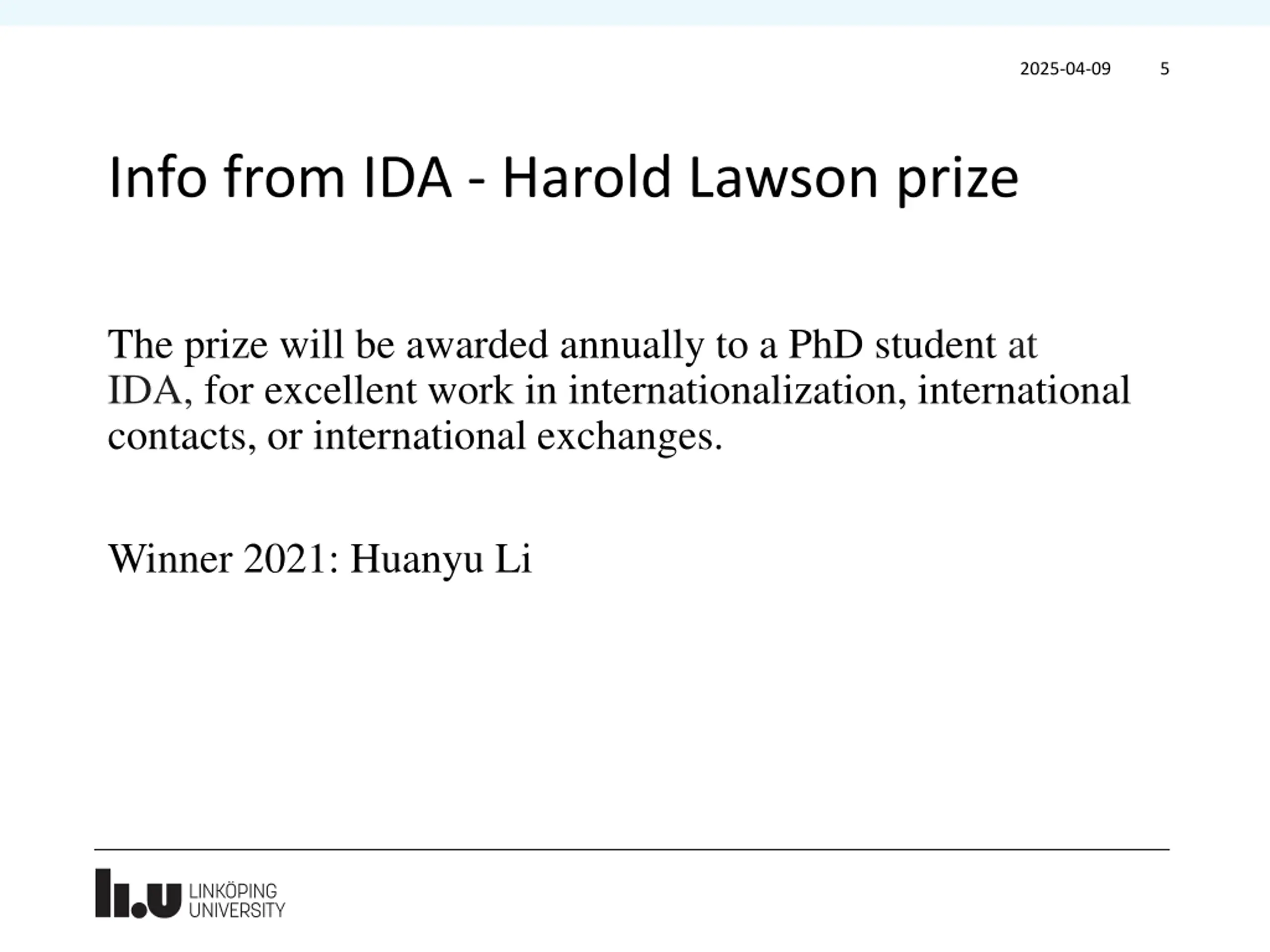 2025-04-09 5 Info from IDA - Harold Lawson prize The prize will be awarded annually to a PhD student at IDA, for excellent work in internationalization, international contacts, or international exchanges. Winner 2021: Huanyu Li
