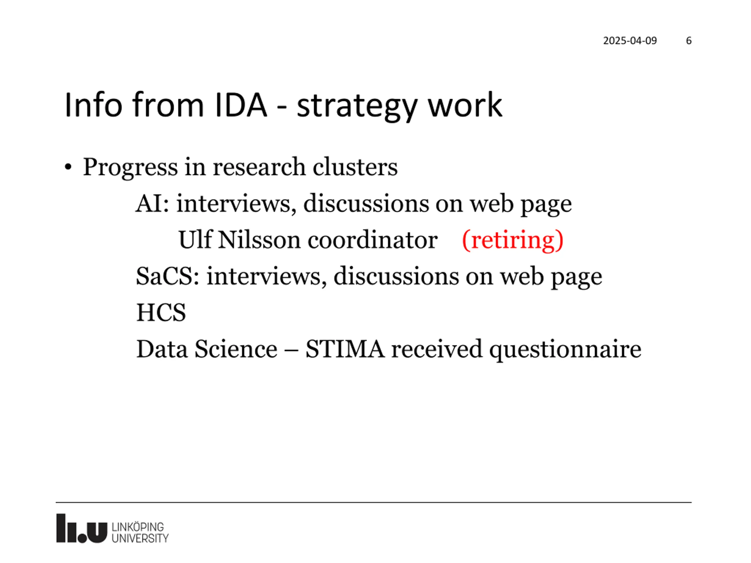 2025-04-09 6 Info from IDA - strategy work Progress in research clusters AI: interviews, discussions on web page Ulf Nilsson coordinator (retiring) SaCS: interviews, discussions on web page HCS Data Science STIMA received questionnaire