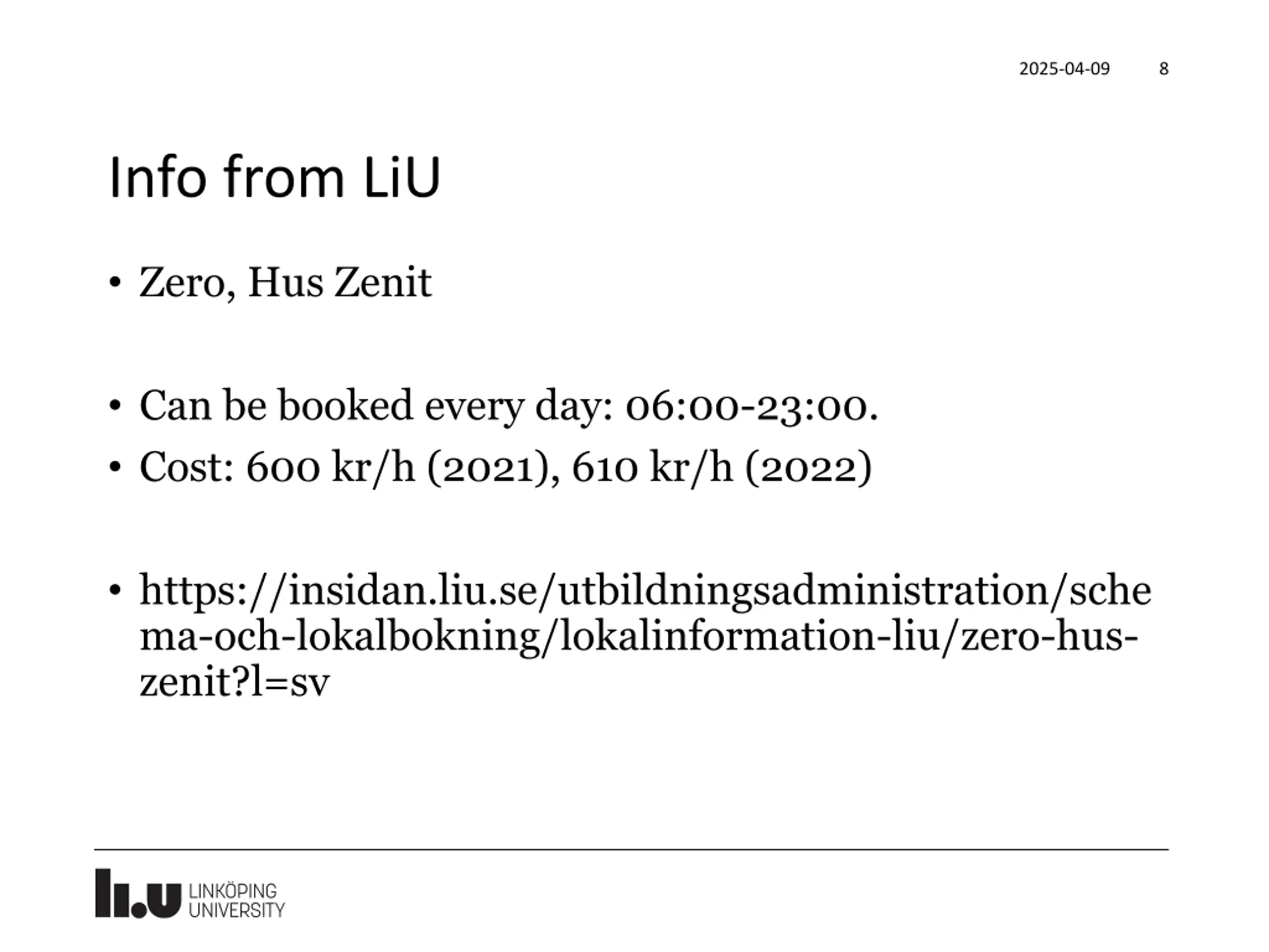 2025-04-09 8 Info from LiU Zero, Hus Zenit Can be booked every day: 06:00-23:00. Cost: 600 kr/h (2021), 610 kr/h (2022) https://insidan.liu.se/utbildningsadministration/sche ma-och-lokalbokning/lokalinformation-liu/zero-hus- zenit?l=sv