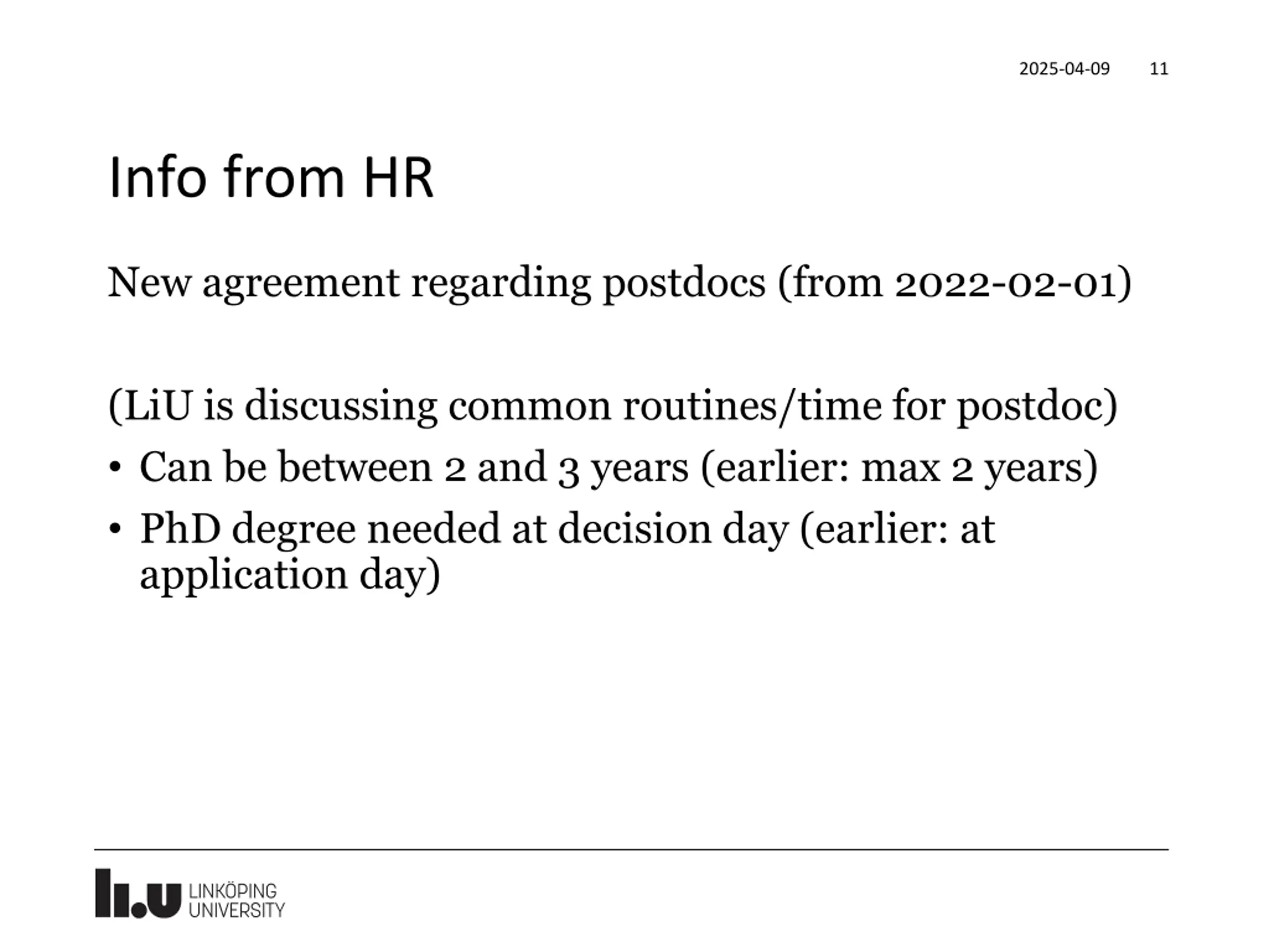 2025-04-09 11 Info from HR New agreement regarding postdocs (from 2022-02-01) (LiU is discussing common routines/time for postdoc) Can be between 2 and 3 years (earlier: max 2 years) PhD degree needed at decision day (earlier: at application day)