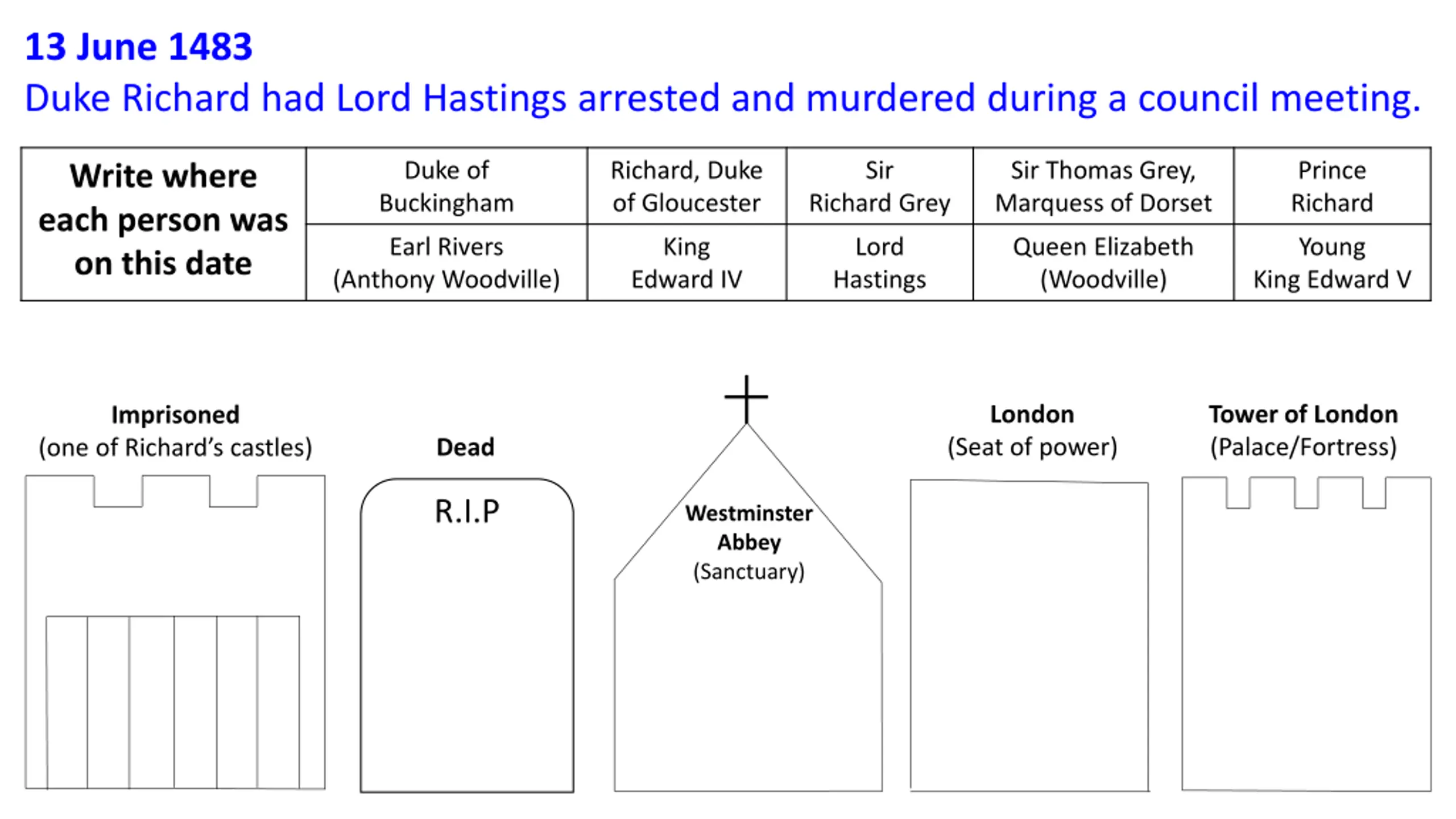 13 June 1483 Duke Richard had Lord Hastings arrested and murdered during a council meeting. Duke of Buckingham Richard, Duke of Gloucester Sir Richard Grey Sir Thomas Grey, Marquess of Dorset Prince Richard Write where each person was on this date Earl Rivers (Anthony Woodville) King Edward IV Lord Hastings Queen Elizabeth (Woodville) Young King Edward V London Tower of London (Palace/Fortress) Imprisoned (Seat of power) Dead (one of Richard s castles) R.I.P Westminster Abbey (Sanctuary)
