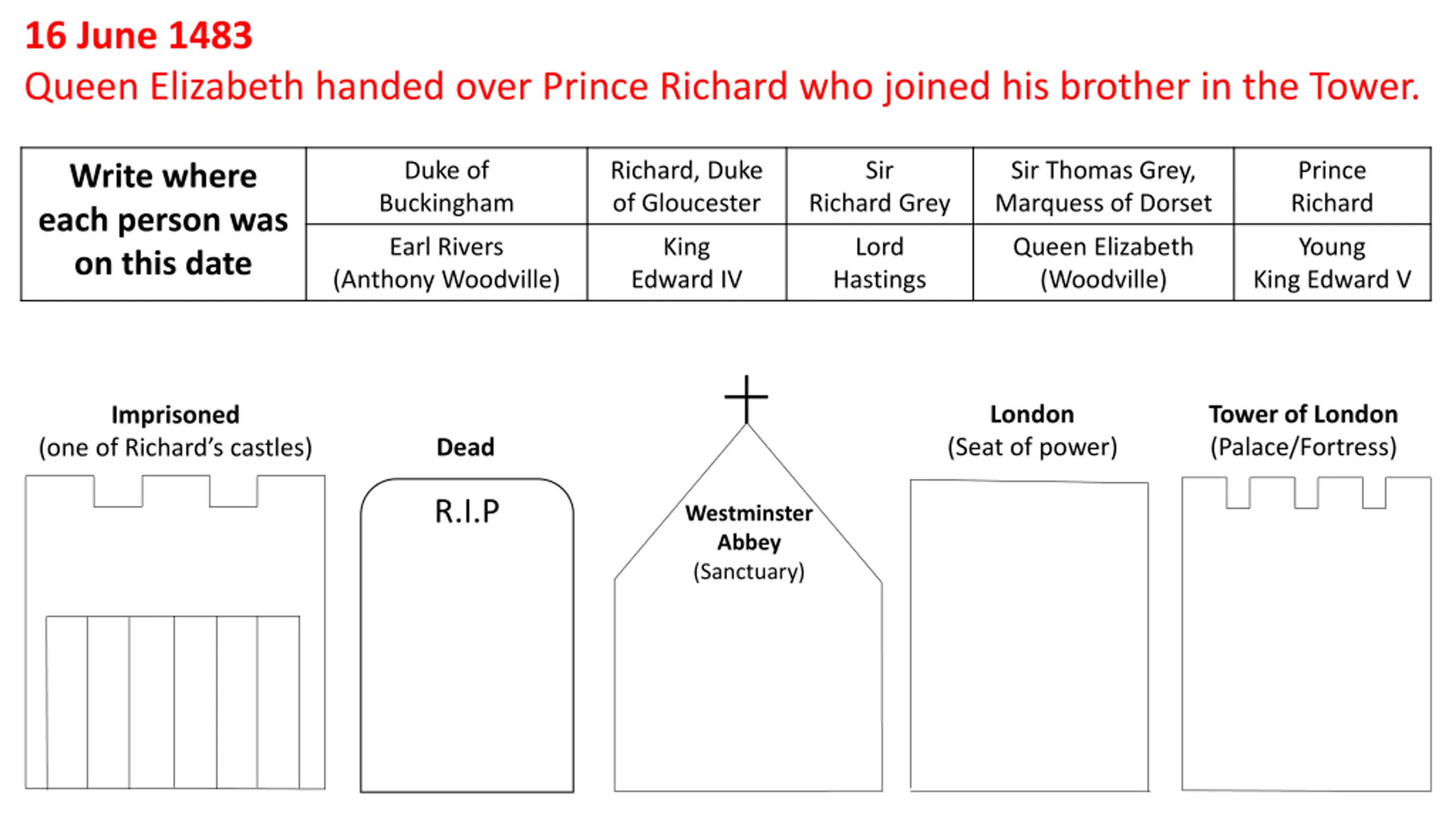 16 June 1483 Queen Elizabeth handed over Prince Richard who joined his brother in the Tower. Duke of Buckingham Richard, Duke of Gloucester Sir Richard Grey Sir Thomas Grey, Marquess of Dorset Prince Richard Write where each person was on this date Earl Rivers (Anthony Woodville) King Edward IV Lord Hastings Queen Elizabeth (Woodville) Young King Edward V London Tower of London (Palace/Fortress) Imprisoned (Seat of power) Dead (one of Richard s castles) R.I.P Westminster Abbey (Sanctuary)