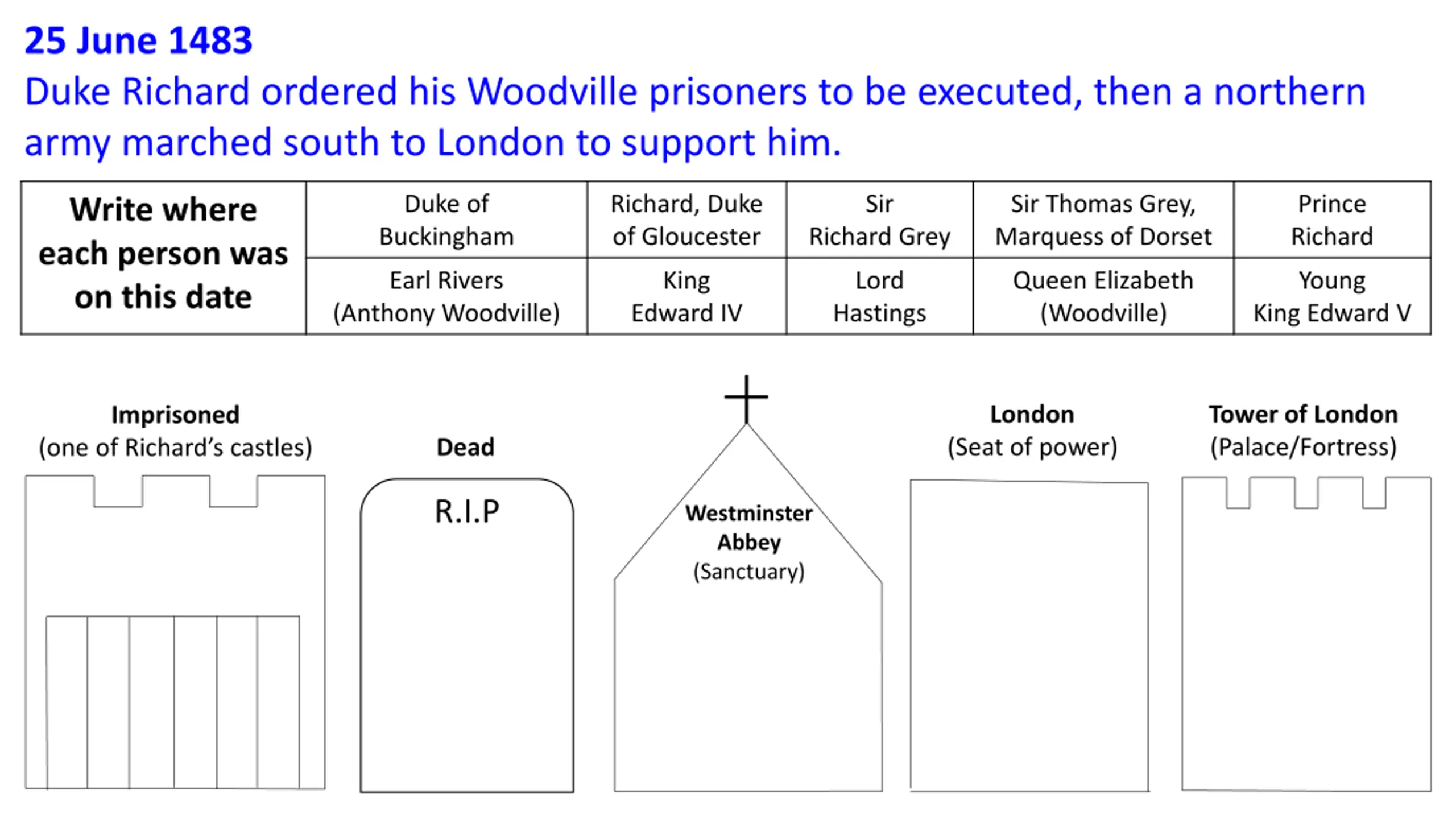 25 June 1483 Duke Richard ordered his Woodville prisoners to be executed, then a northern army marched south to London to support him. Duke of Buckingham Richard, Duke of Gloucester Sir Richard Grey Sir Thomas Grey, Marquess of Dorset Prince Richard Write where each person was on this date Earl Rivers (Anthony Woodville) King Edward IV Lord Hastings Queen Elizabeth (Woodville) Young King Edward V London Tower of London (Palace/Fortress) Imprisoned (Seat of power) Dead (one of Richard s castles) R.I.P Westminster Abbey (Sanctuary)