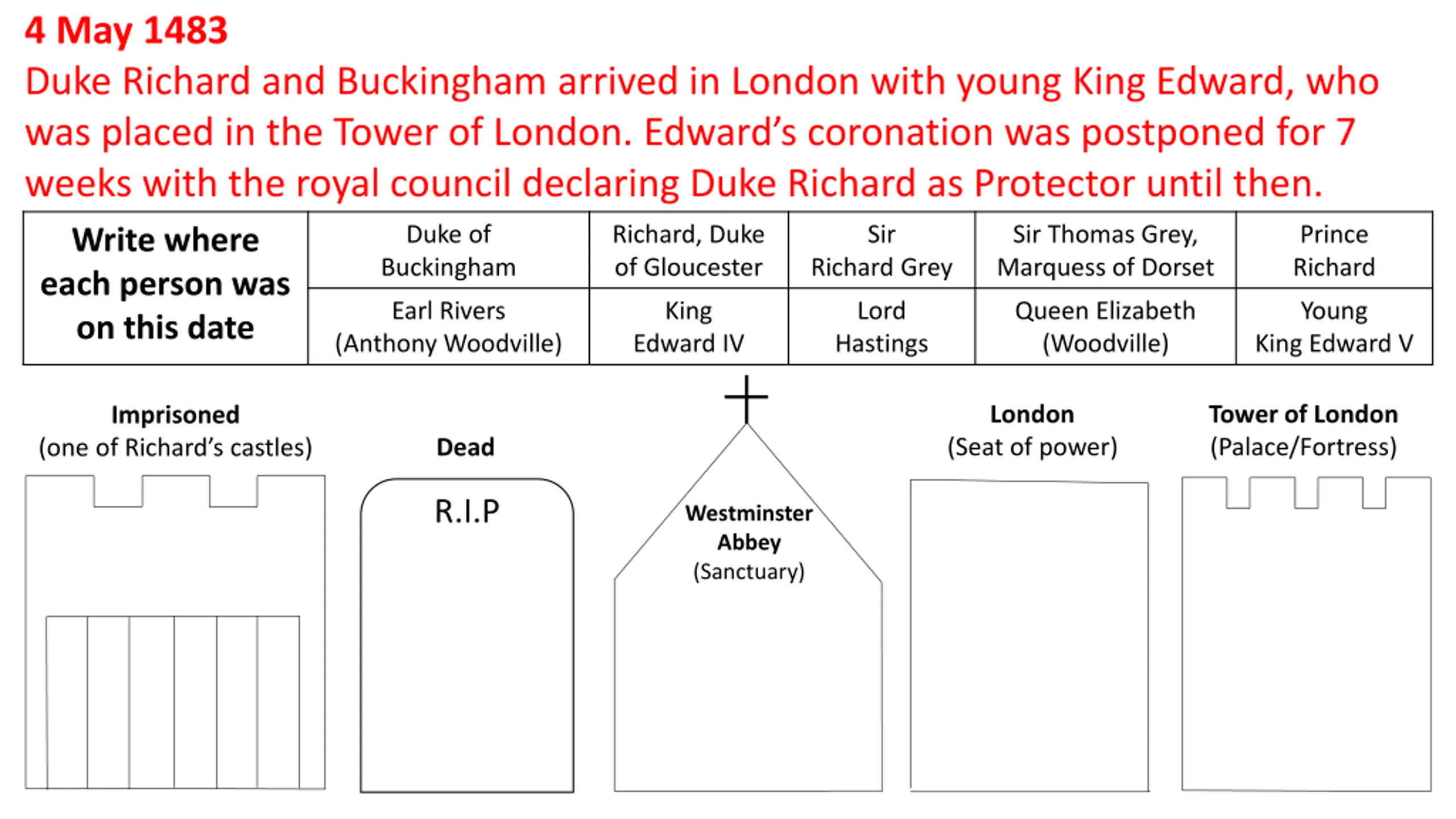 4 May 1483 Duke Richard and Buckingham arrived in London with young King Edward, who was placed in the Tower of London. Edward s coronation was postponed for 7 weeks with the royal council declaring Duke Richard as Protector until then. Write where each person was on this date (Anthony Woodville) Edward IV Duke of Buckingham Richard, Duke of Gloucester Sir Richard Grey Sir Thomas Grey, Marquess of Dorset Prince Richard Earl Rivers King Lord Hastings Queen Elizabeth (Woodville) Young King Edward V London Tower of London (Palace/Fortress) Imprisoned (Seat of power) Dead (one of Richard s castles) R.I.P Westminster Abbey (Sanctuary)