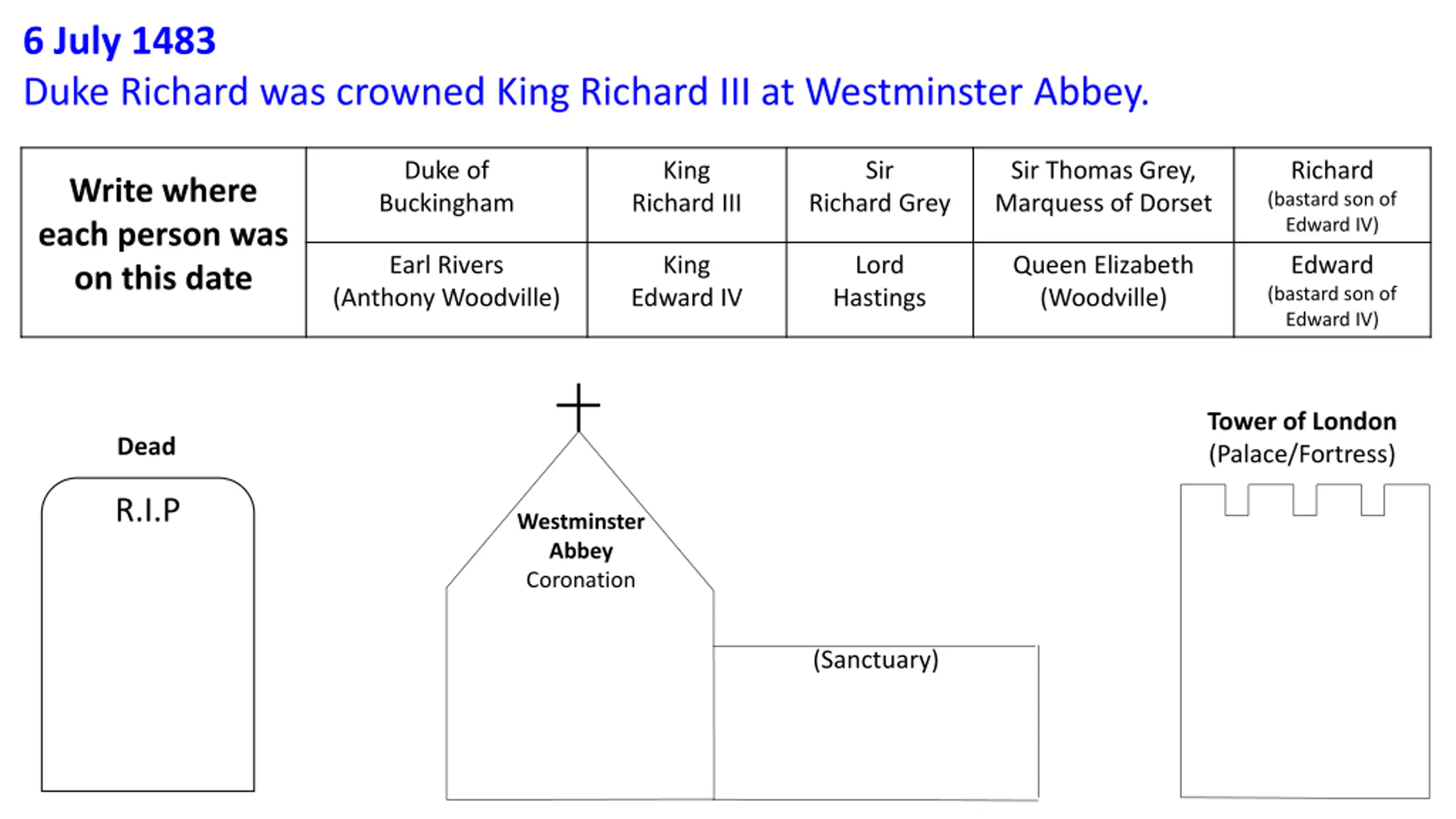 6 July 1483 Duke Richard was crowned King Richard III at Westminster Abbey. Duke of Buckingham King Richard III Sir Richard Grey Sir Thomas Grey, Marquess of Dorset Richard (bastard son of Edward IV) Write where each person was on this date Earl Rivers (Anthony Woodville) King Edward IV Lord Hastings Queen Elizabeth (Woodville) Edward (bastard son of Edward IV) Tower of London (Palace/Fortress) Dead R.I.P Westminster Abbey Coronation (Sanctuary)