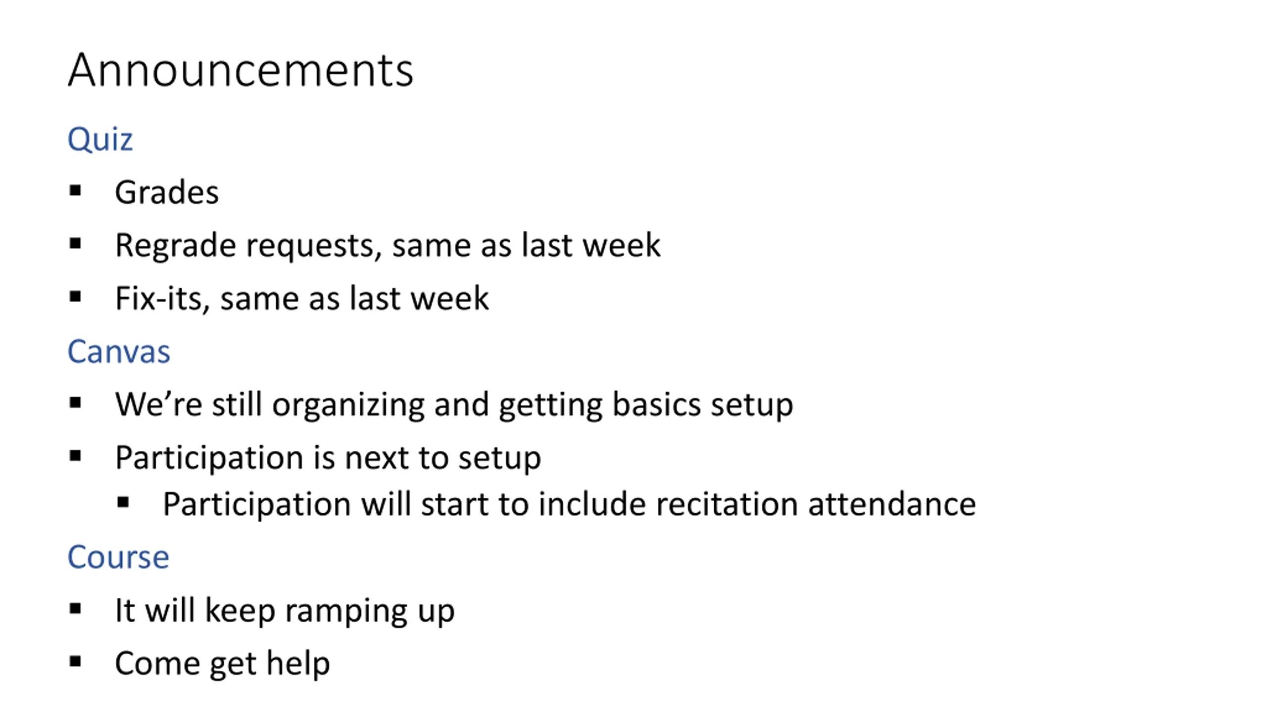 Announcements Quiz Grades Regrade requests, same as last week Fix-its, same as last week Canvas We re still organizing and getting basics setup Participation is next to setup Participation will start to include recitation attendance Course It will keep ramping up Come get help