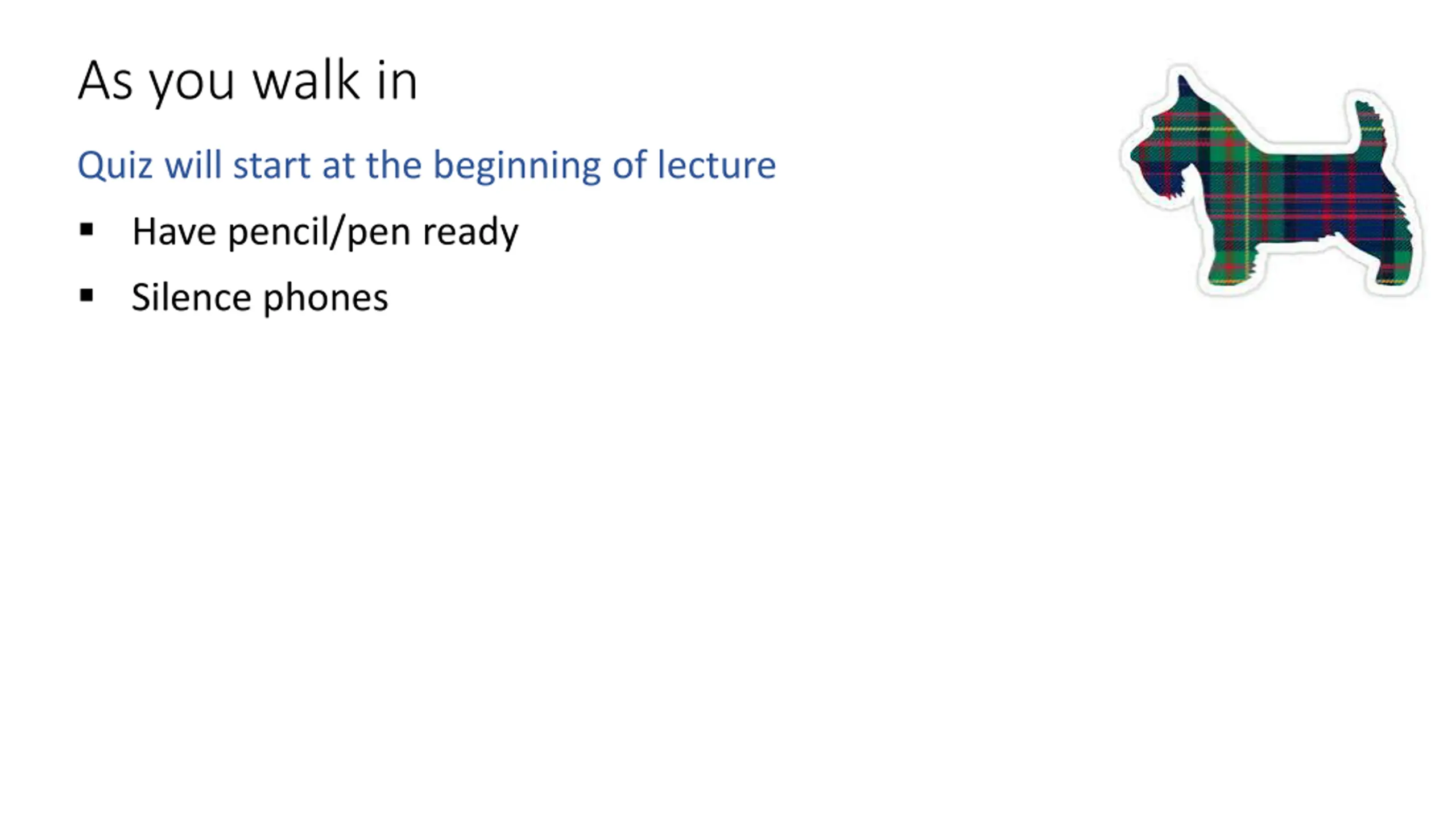 As you walk in Quiz will start at the beginning of lecture Have pencil/pen ready Silence phones