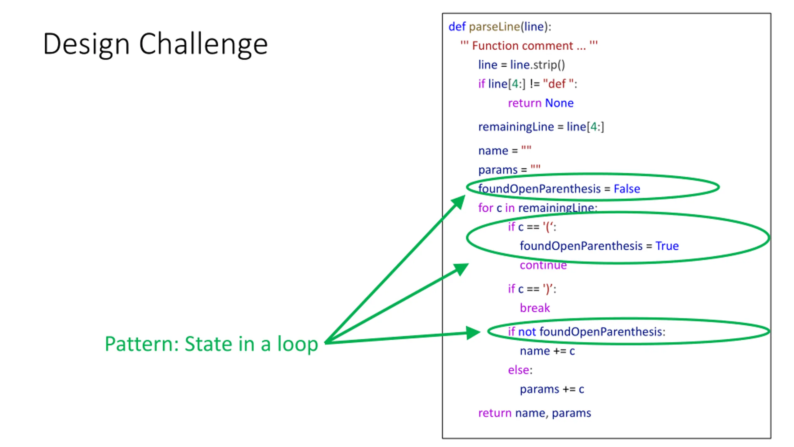 def parseLine(line): ''' Function comment ... ''' line = line.strip() if line[4:] != "def ": return None Design Challenge remainingLine = line[4:] name = "" params = "" foundOpenParenthesis = False for c in remainingLine: if c == '( : foundOpenParenthesis = True continue if c == ') : break if not foundOpenParenthesis: name += c else: params += c Pattern: State in a loop return name, params