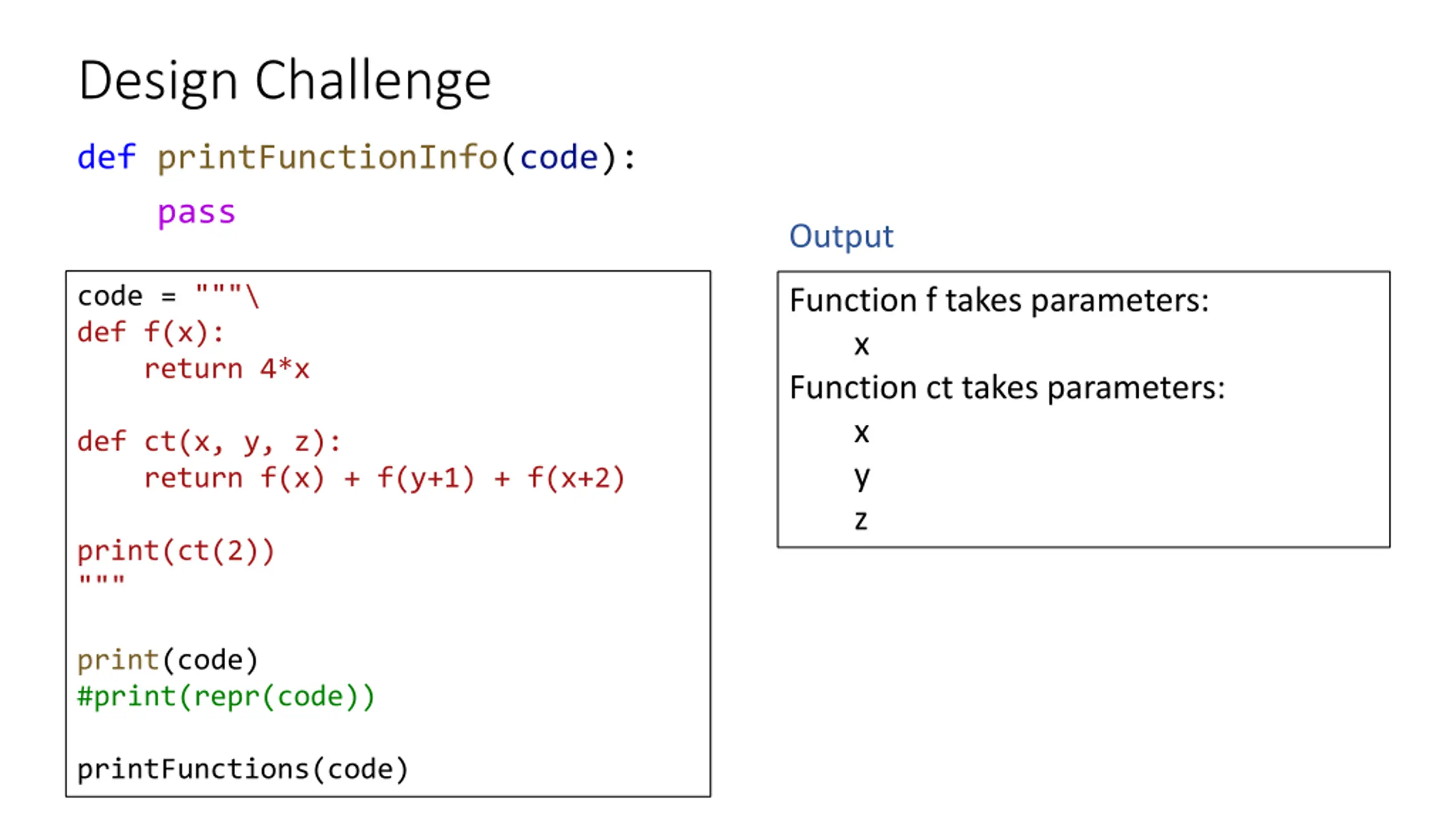 Design Challenge def printFunctionInfo(code): pass Output code = """\ def f(x): return 4*x def ct(x, y, z): return f(x) + f(y+1) + f(x+2) print(ct(2)) """ Function f takes parameters: x Function ct takes parameters: x y z print(code) #print(repr(code)) printFunctions(code)