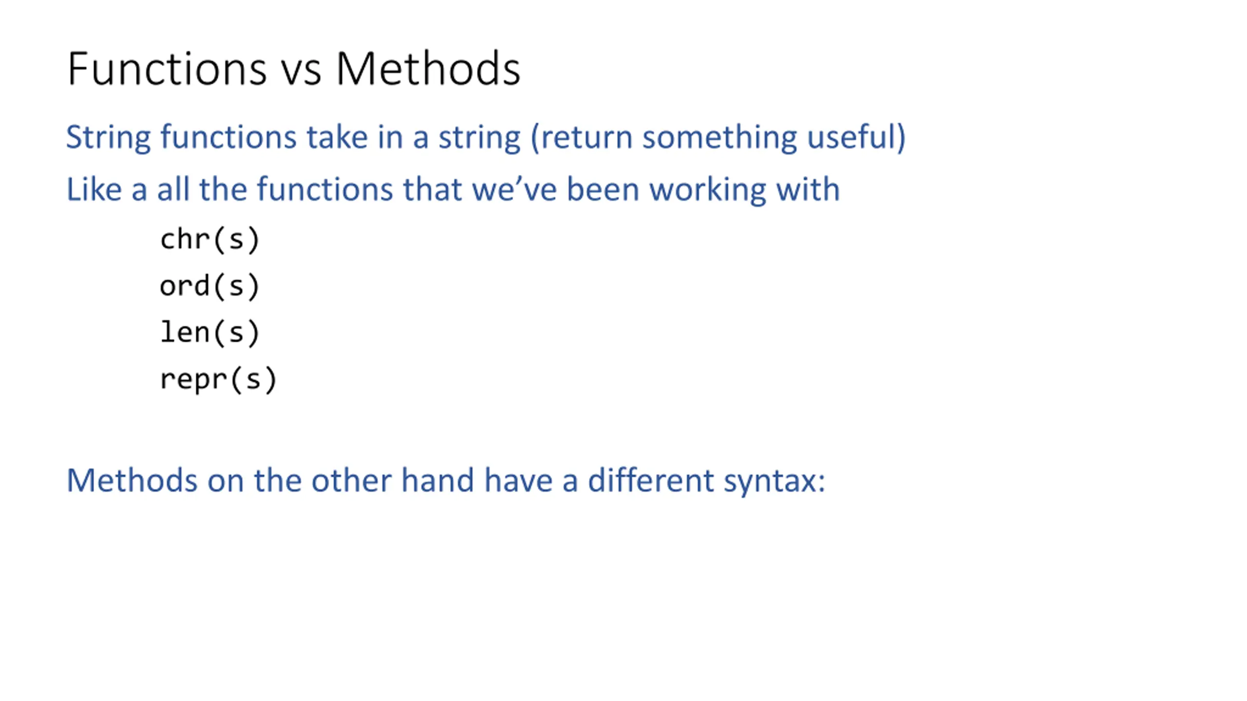 Functions vs Methods String functions take in a string (return something useful) Like a all the functions that we ve been working with chr(s) ord(s) len(s) repr(s) Methods on the other hand have a different syntax: