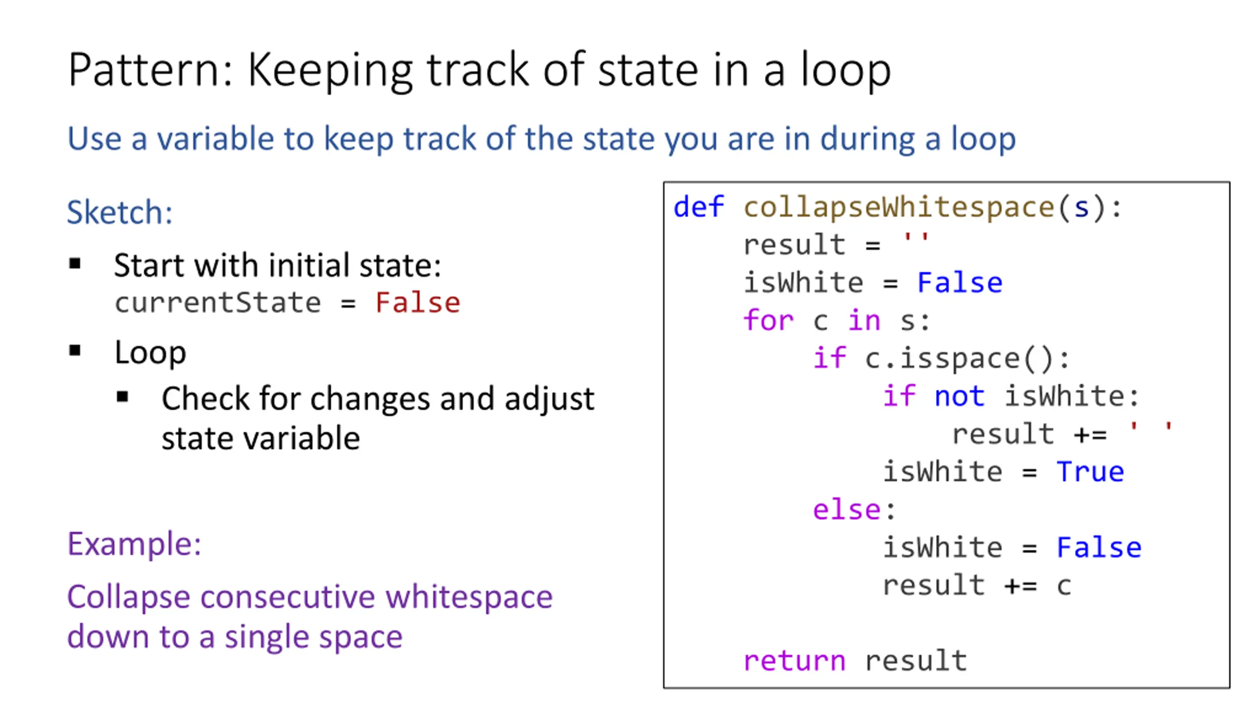Pattern: Keeping track of state in a loop Use a variable to keep track of the state you are in during a loop def collapseWhitespace(s): result = '' isWhite = False for c in s: if c.isspace(): if not isWhite: result += ' ' isWhite = True else: isWhite = False result += c Sketch: Start with initial state: currentState = False Loop Check for changes and adjust state variable Example: Collapse consecutive whitespace down to a single space return result