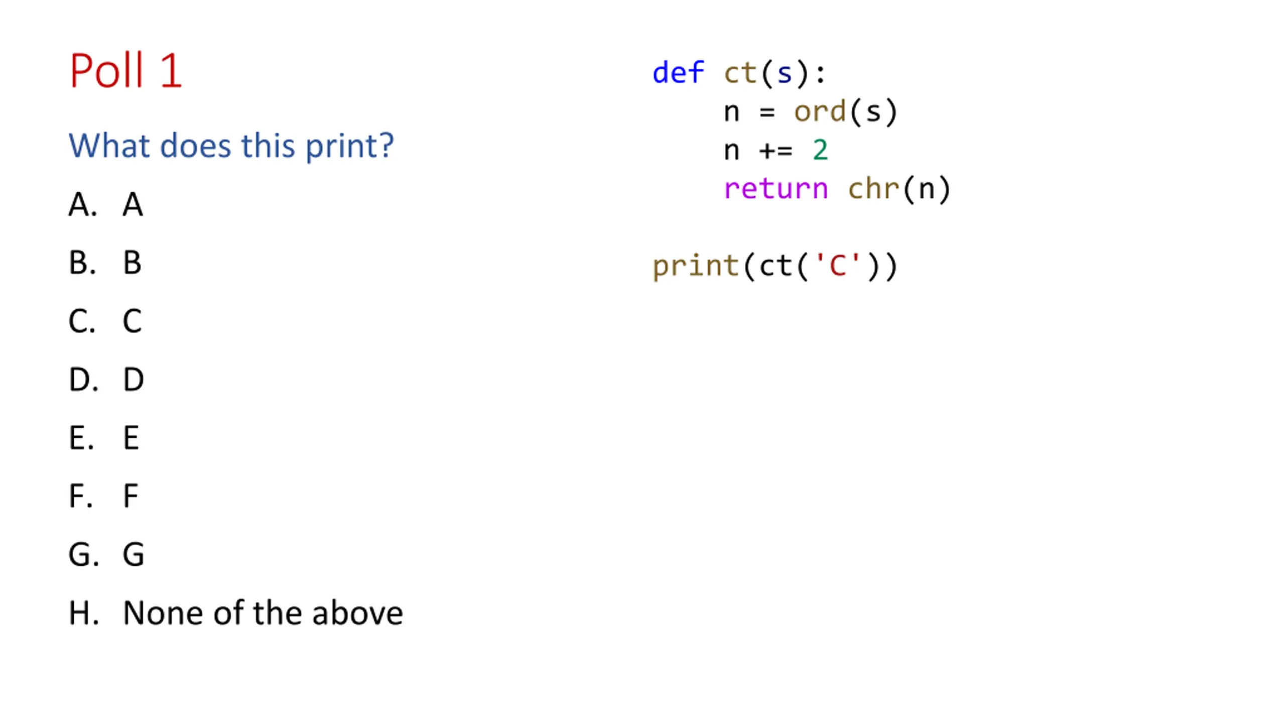 Poll 1 def ct(s): n = ord(s) n += 2 return chr(n) What does this print? A. A B. B print(ct('C')) C. C D. D E. E F. F G. G H. None of the above