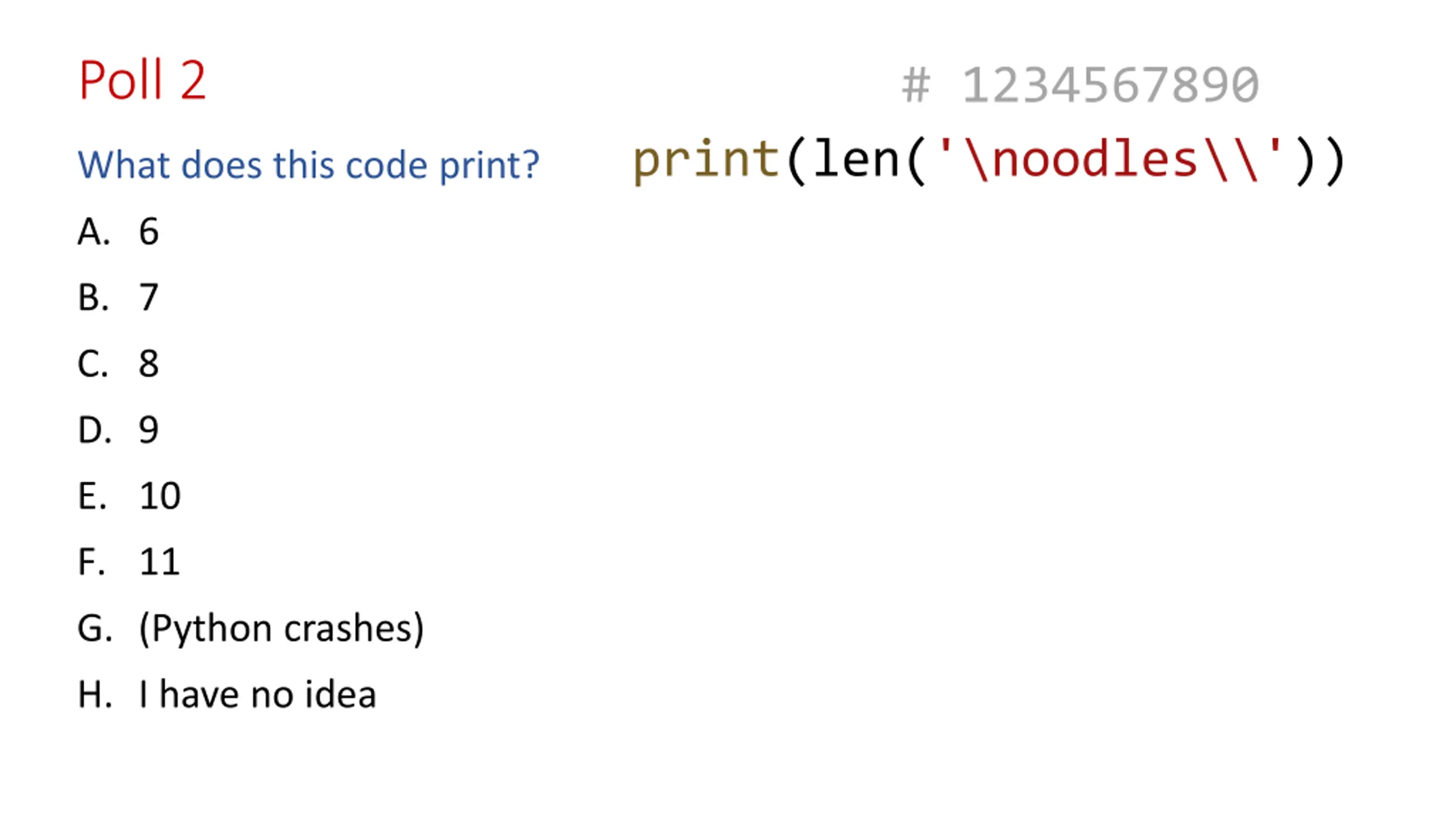 Poll 2 # 1234567890 print(len('\noodles\\')) What does this code print? A. 6 B. 7 C. 8 D. 9 E. 10 F. 11 G. (Python crashes) H. I have no idea