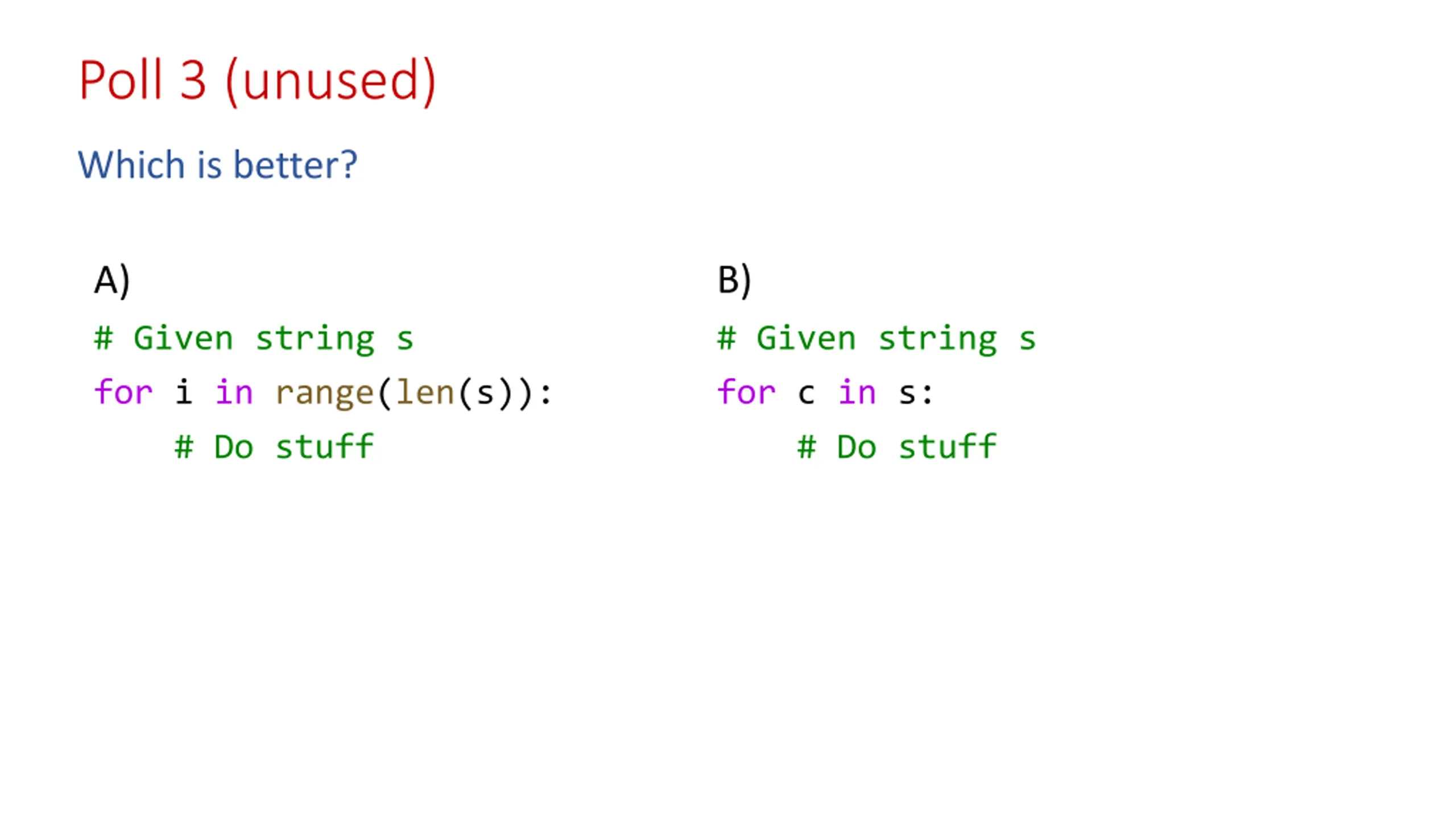 Poll 3 (unused) Which is better? B) A) # Given string s for i in range(len(s)): # Given string s for c in s: # Do stuff # Do stuff