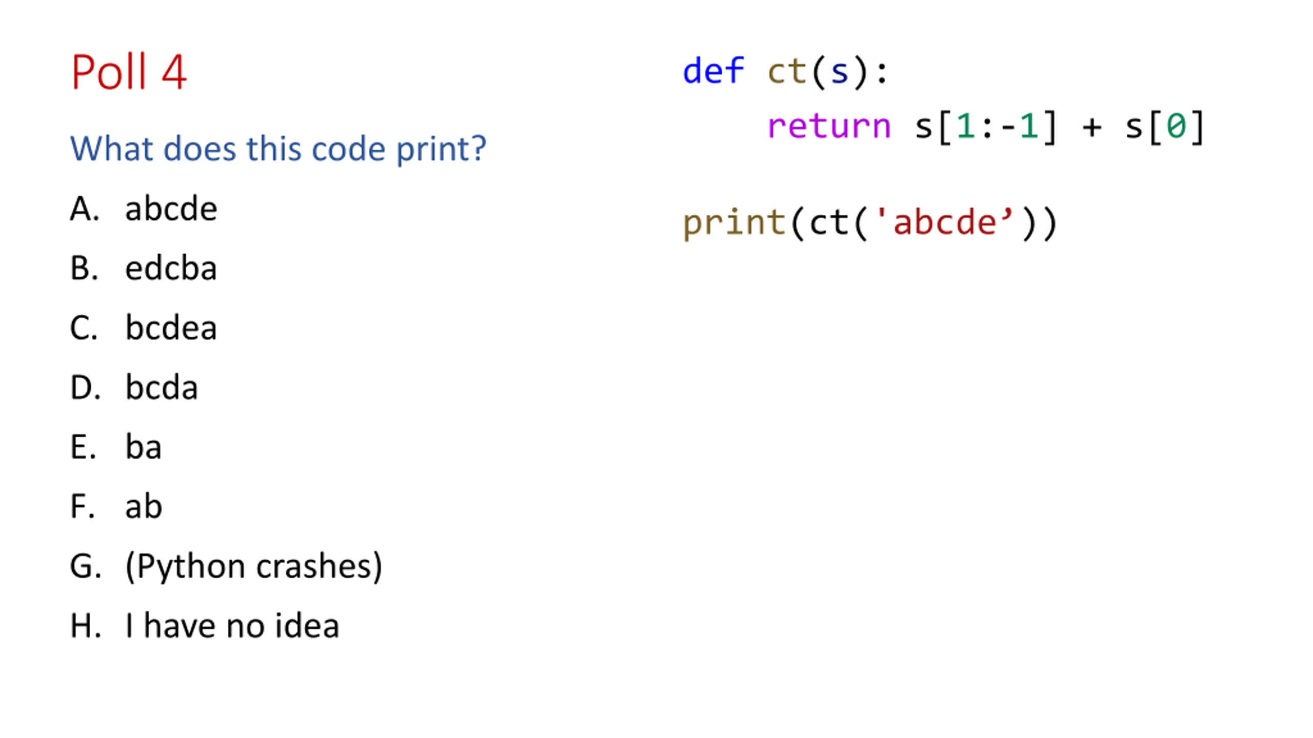 Poll 4 def ct(s): return s[1:-1] + s[0] What does this code print? A. abcde print(ct('abcde )) B. edcba C. bcdea D. bcda E. ba F. ab G. (Python crashes) H. I have no idea
